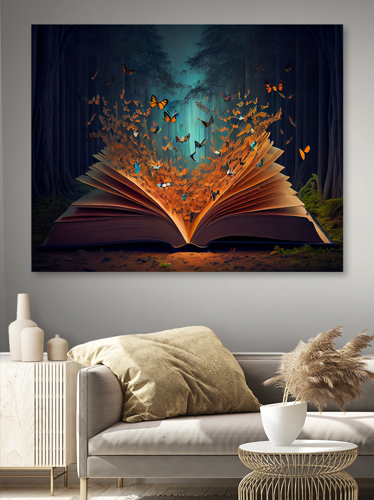 Wyobraź sobie: przytulny zakątek w Twoim domu, w którym magia wylewa się ze ścian. Dokładnie to zapewnia ten wydruk na płótnie “Książka z motylami”. Masz tę czarującą otwartą książkę, żywe motyle fruwające na zewnątrz, a wszystko to na tle sennego lasu. Poważnie, to jak wejście do bajki za każdym razem, gdy ją widzisz. Niezależnie od tego, czy znajduje się w salonie, czy w cichym kąciku do czytania, z pewnością zachęci do poczucia zachwytu i opowiadania historii. Dodatkowo, te bogate kolory – po prostu rzucają się w oczy! To wspaniała, kapryśna ucieczka bez wychodzenia na zewnątrz – jakie to wspaniałe!