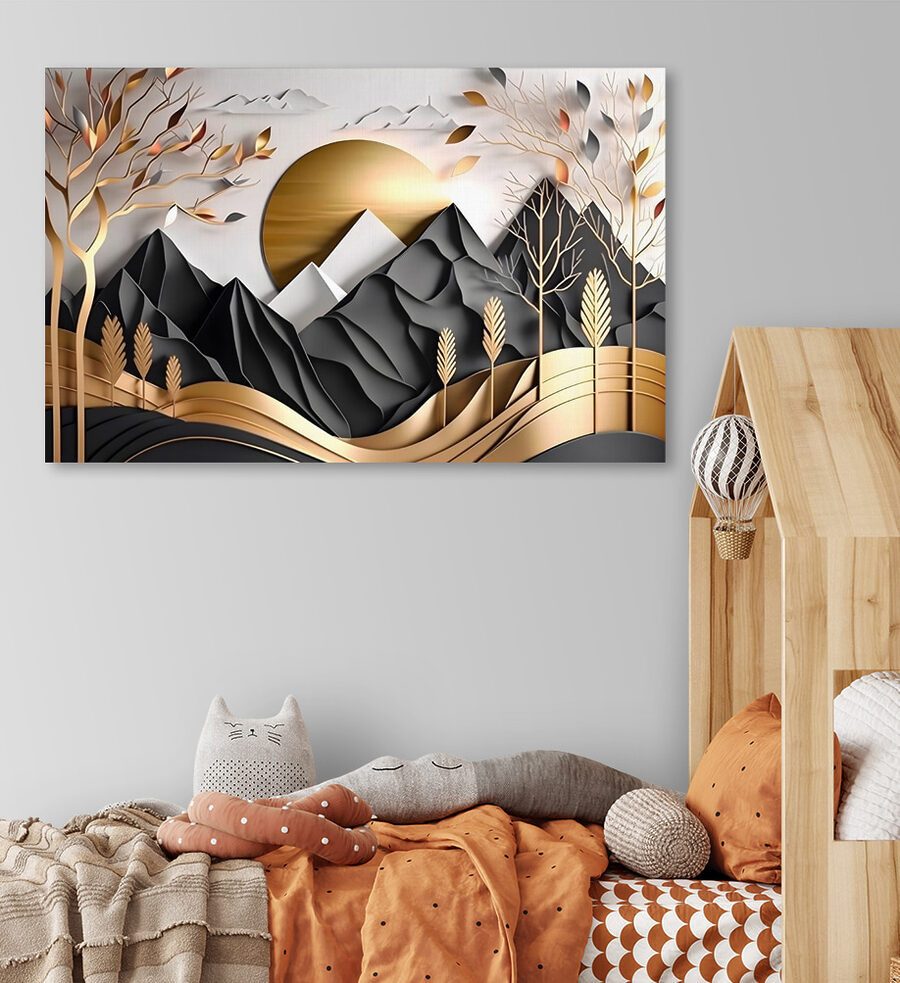 Przekształć pustą ścianę w spokojną ucieczkę dzięki temu oszałamiającemu wydrukowi na płótnie! Wyobraź sobie, że wracasz do domu do sennego krajobrazu gór i drzew, który jest jak delikatny uścisk natury. Ciepłe odcienie i eleganckie formy są jak delikatny szept lasu, zachęcający do spokoju i kreatywności. Wyobraź sobie, że popijasz poranną kawę, wpatrując się w tę sztukę, czując się nieco bardziej połączony ze wspaniałą przyrodą. Niezależnie od tego, czy znajduje się w salonie, czy w przytulnym kąciku do czytania, ten element dodaje idealny dotyk spokoju. To coś więcej niż dekoracja; to doświadczenie, które czeka, aby się wydarzyć!