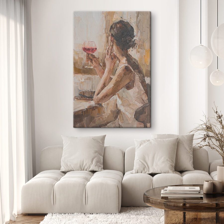Wejdź w chwilę spokoju z tym urzekającym płótnem przedstawiającym kobietę delektującą się winem. Jest coś niemal magicznego w sposobie, w jaki światło tańczy nad jej kieliszkiem, zachęcając do marzeń i ciepłych rozmów. Ten kawałek szepcze przytulne wieczory, śmiech z przyjaciółmi i prostą radość z dobrego staromodnego toastu. Idealny do salonu lub cichego zakątka, dodaje odrobinę ciepła i elegancji do każdej przestrzeni. Wyobraź sobie, że zwijasz się w kłębek z książką w pobliżu, kieliszkiem w dłoni, chłonąc spokojne wibracje – czujesz to? To dzieło sztuki jest początkiem rozmowy, delikatnym przypomnieniem, aby delektować się małymi przyjemnościami życia.