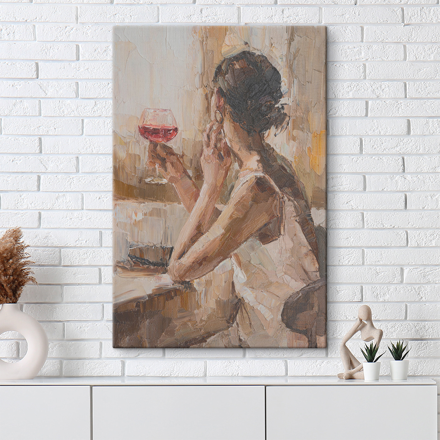 Wejdź w chwilę spokoju z tym urzekającym płótnem przedstawiającym kobietę delektującą się winem. Jest coś niemal magicznego w sposobie, w jaki światło tańczy nad jej kieliszkiem, zachęcając do marzeń i ciepłych rozmów. Ten kawałek szepcze przytulne wieczory, śmiech z przyjaciółmi i prostą radość z dobrego staromodnego toastu. Idealny do salonu lub cichego zakątka, dodaje odrobinę ciepła i elegancji do każdej przestrzeni. Wyobraź sobie, że zwijasz się w kłębek z książką w pobliżu, kieliszkiem w dłoni, chłonąc spokojne wibracje – czujesz to? To dzieło sztuki jest początkiem rozmowy, delikatnym przypomnieniem, aby delektować się małymi przyjemnościami życia.