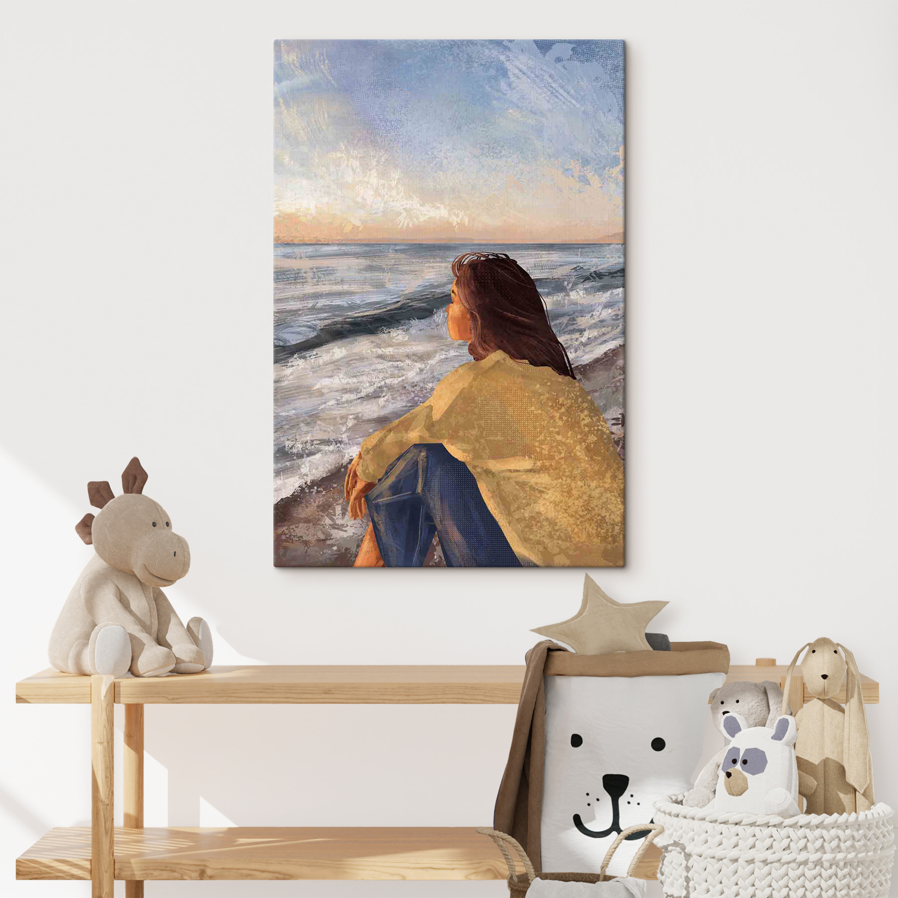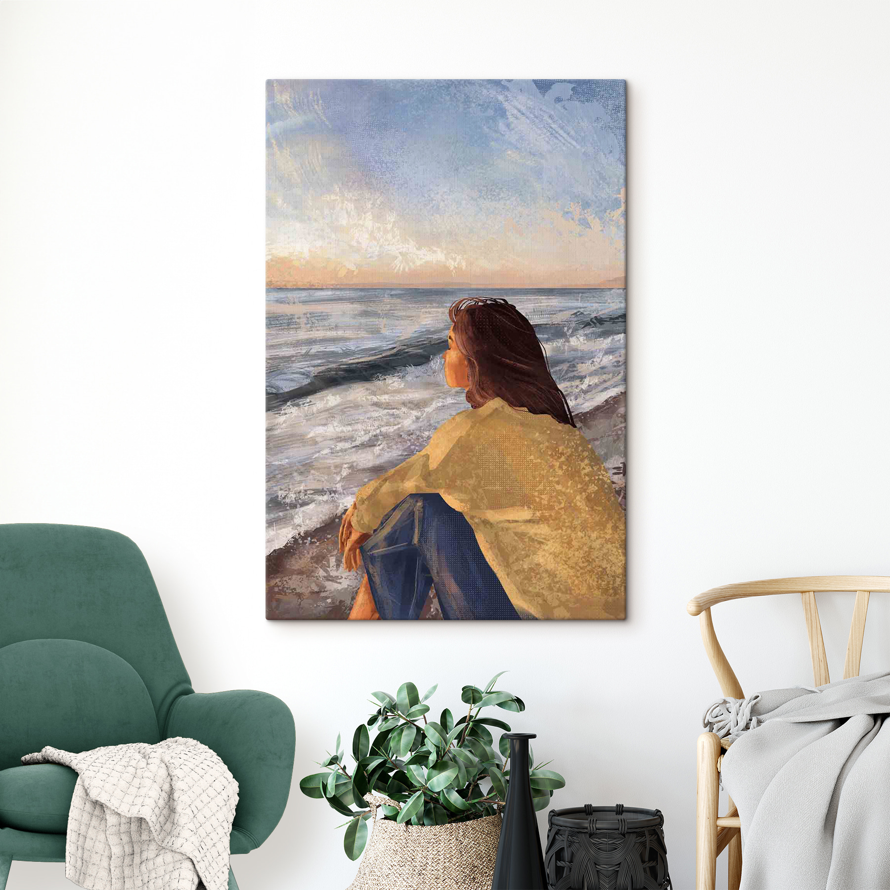 Wyobraź sobie: spokojny wieczór, podczas którego siedzisz nad brzegiem morza, czując miękki piasek pod stopami i obserwując słońce powoli zachodzące nad bezkresnym oceanem. To właśnie oddaje ten wydruk na płótnie – niemal magiczny moment, w którym czas wydaje się stać w miejscu. Zagubiona w swoich myślach kobieta spogląda na łagodne fale. Można niemal usłyszeć szum morza i poczuć lekką bryzę na twarzy. Idealny dla każdego, kto potrzebuje odrobiny spokoju w swoim domu. Niezależnie od tego, czy jest to centralny element salonu, czy spokojny dodatek do sypialni, ten element zachęca do zatrzymania się i marzeń. Kto by tego nie chciał?