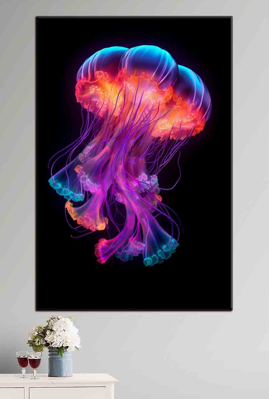 Zobacz ten wspaniały wydruk na płótnie zatytułowany “Neonowe meduzy szybujące w ciemności”. Czy nie można sobie wyobrazić jej blasku w ciemnym pomieszczeniu? Ten kawałek sprawia wrażenie, jakbyś nurkował głęboko w oceanie bez opuszczania kanapy. Żywe, neonowe kolory na czarnym jak smoła tle to coś innego – to tak, jakby te meduzy unosiły się bezpośrednio na płótnie. Idealny do miejsc, które potrzebują odrobiny intrygi, niezależnie od tego, czy jest to salon, domowe biuro, czy nawet modna kawiarnia. Masz przestrzeń, która potrzebuje popu? To jest to.