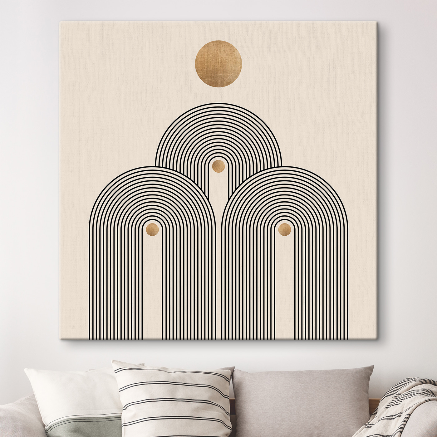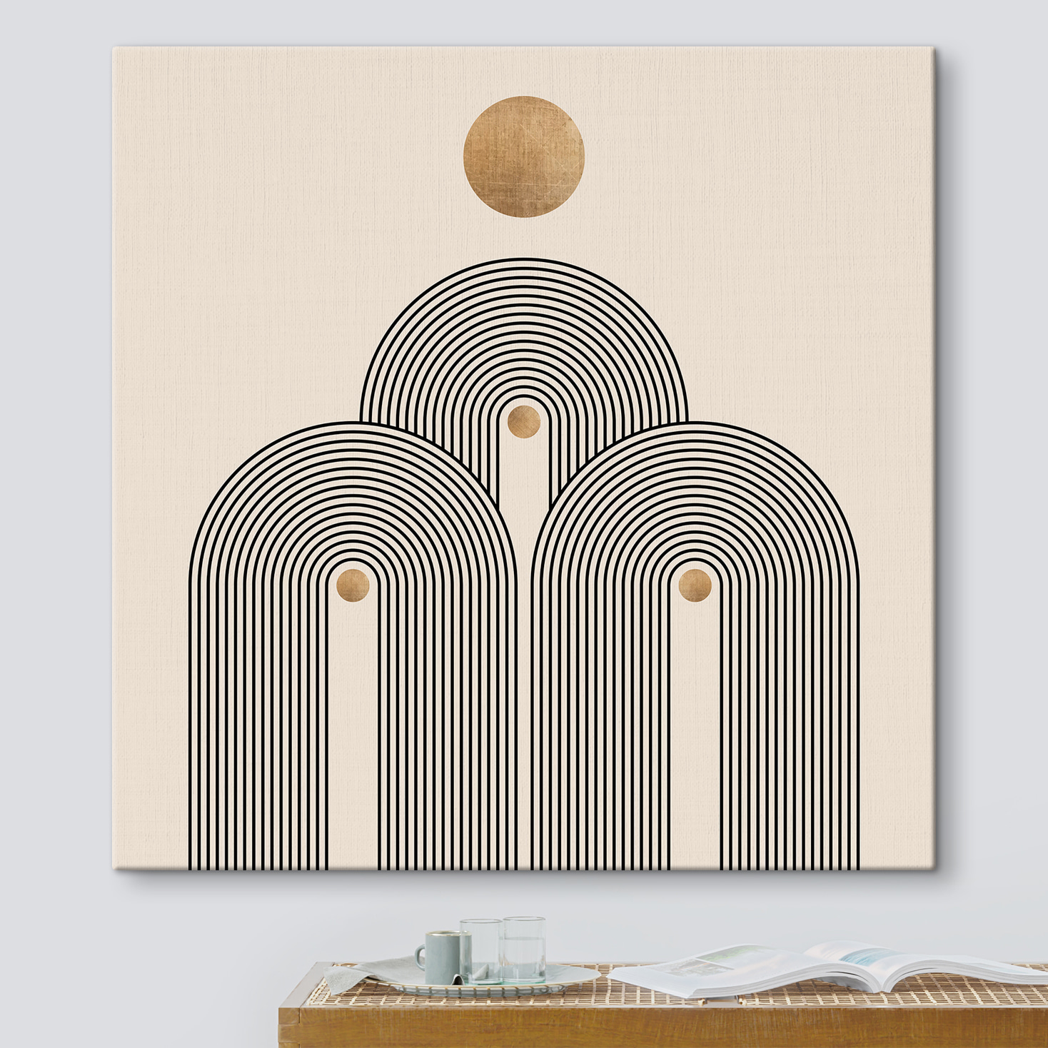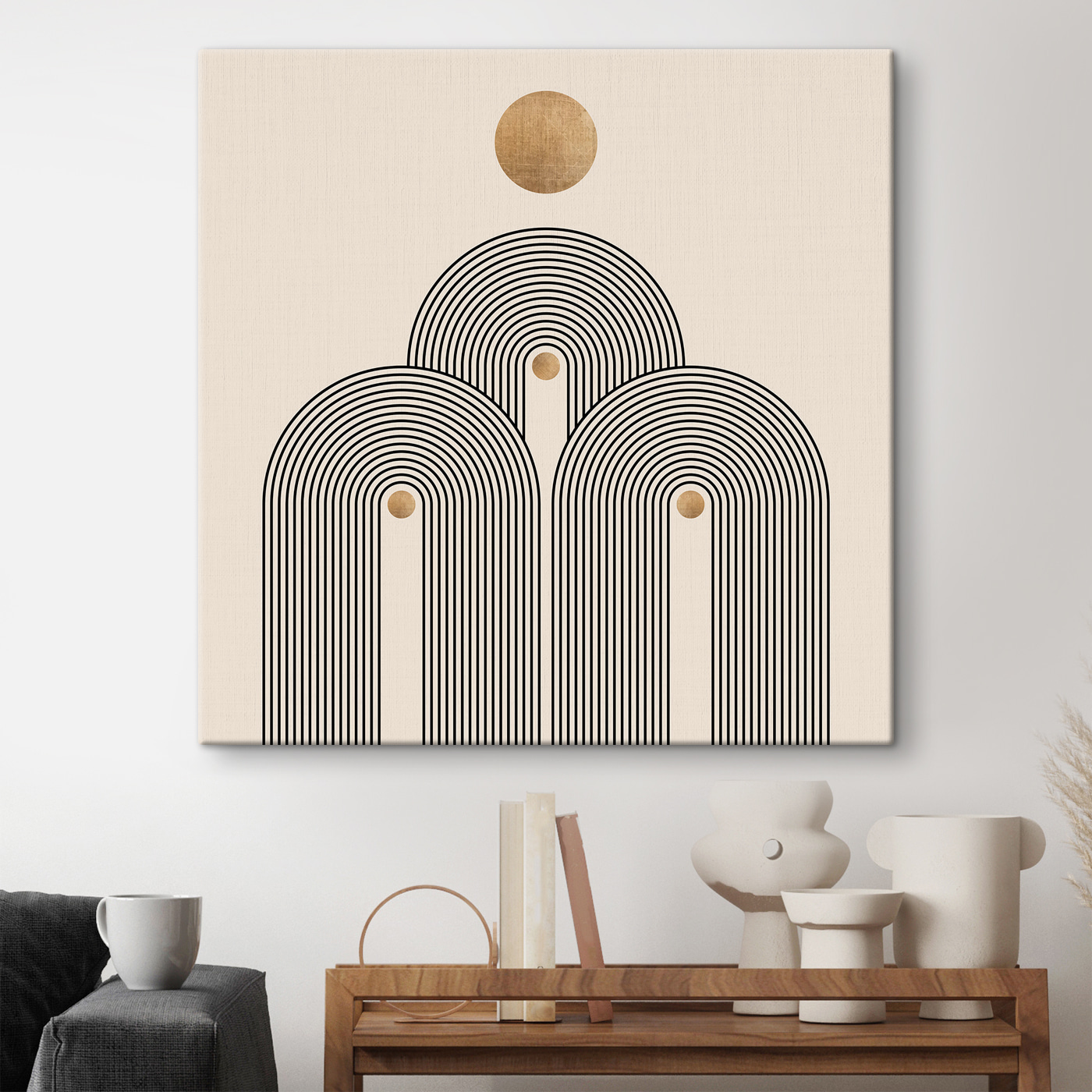 Rozjaśnij każdą ścianę dzięki temu drukowi na płótnie z zabawnym okrągłym wzorem otoczonym odważnymi czarnymi liniami. To trochę jak nowoczesne dzieło sztuki, które sprawia, że zastanawiasz się nad ważnymi życiowymi pytaniami, a jednocześnie chcesz po prostu napić się kawy. Neutralne tło sprawia, że wzór ten idealnie pasuje do przytulnego kącika, a nawet do tętniącego życiem salonu. Wyobraź sobie pogawędkę z przyjaciółmi pod jej urokiem, a może odnalezienie zen podczas cichej chwili, pozwalając jej rytmowi prowadzić twoje myśli. Prosty, urzekający sposób na ożywienie przestrzeni!