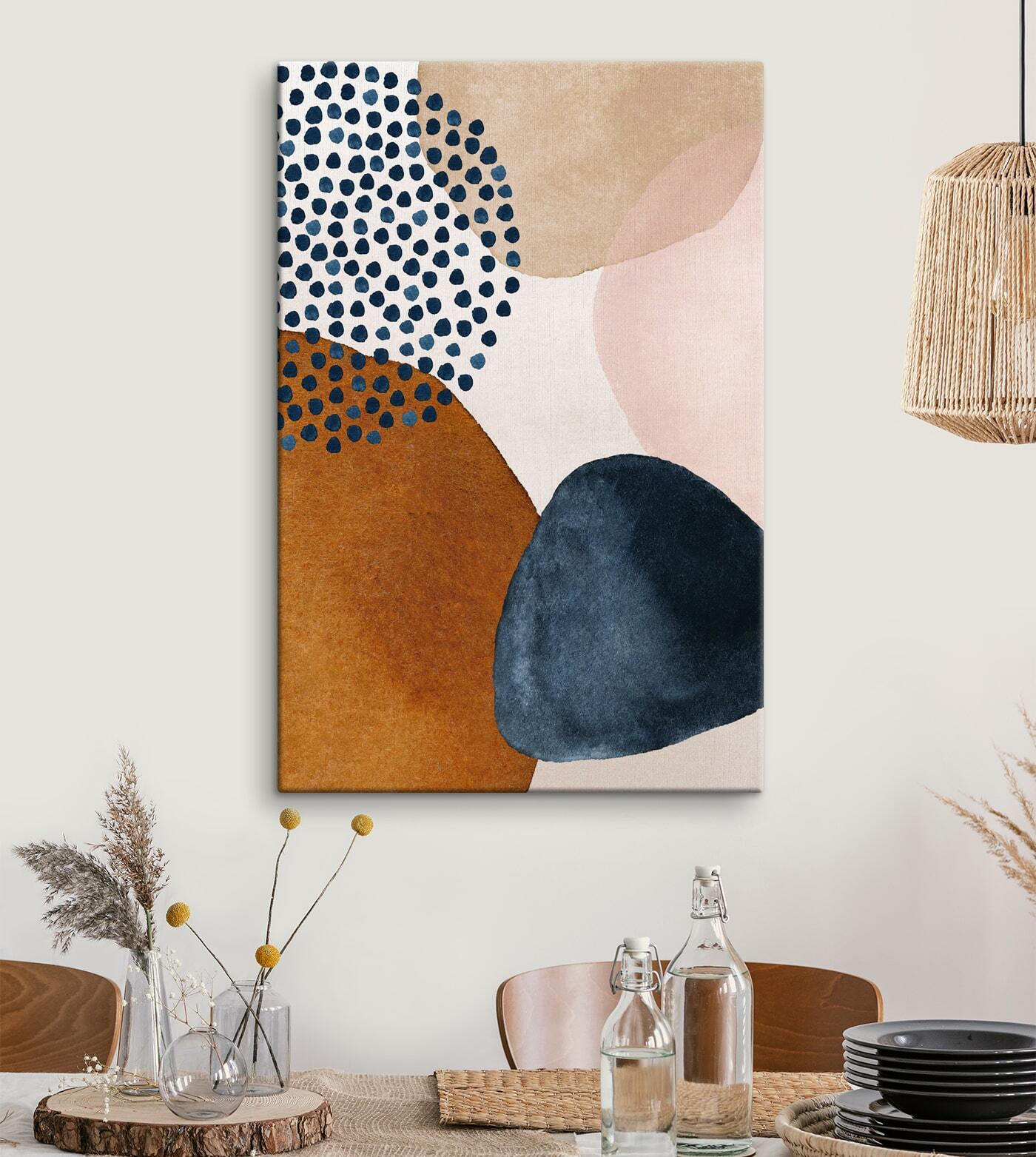 Czy kiedykolwiek czułeś, że twoje ściany potrzebują trochę, nie wiem, czegoś? Ten wydruk na płótnie może być idealnym rozwiązaniem. “Abstrakcyjne kształty i kropki” brzmi fantazyjnie, prawda? Ma ten chłodny, boho klimat z odrobiną nowoczesnego loftowego uroku. Idealny do tych przytulnych zakątków, a może nawet nad kanapą – gdziekolwiek!
