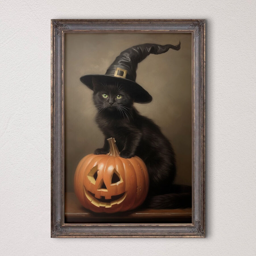 Czy kiedykolwiek widziałeś kota w kapeluszu czarownicy? To zabawne płótno oddaje ten magiczny moment – idealne dla każdego, kogo wystrój potrzebuje odrobiny kaprysu. Wyobraź sobie powrót do domu po długim dniu. Ten uroczy kot siedzący na dyni wita cię psotnym uśmiechem. To tak, jakby strzegł twojej przestrzeni z mieszanką tajemniczości i uroku. Uśmiechniesz się za każdym razem, gdy przejdziesz obok. Halloweenowy klimat łączy się z codziennym urokiem, dzięki czemu każde pomieszczenie staje się nieco bardziej czarujące. Kto by pomyślał, że sztuka może być tak zachwycająca?