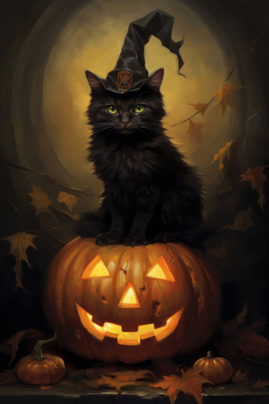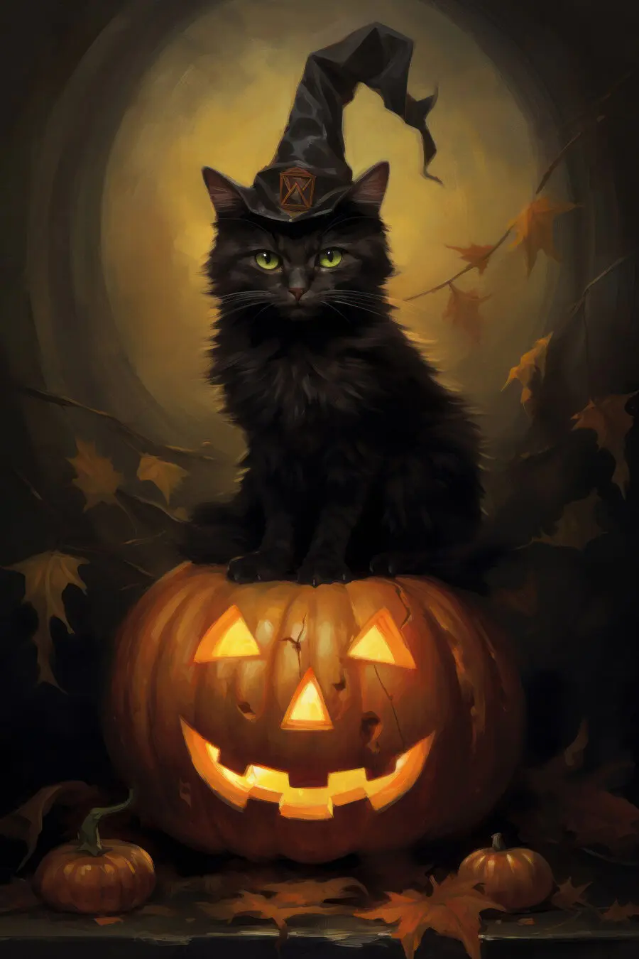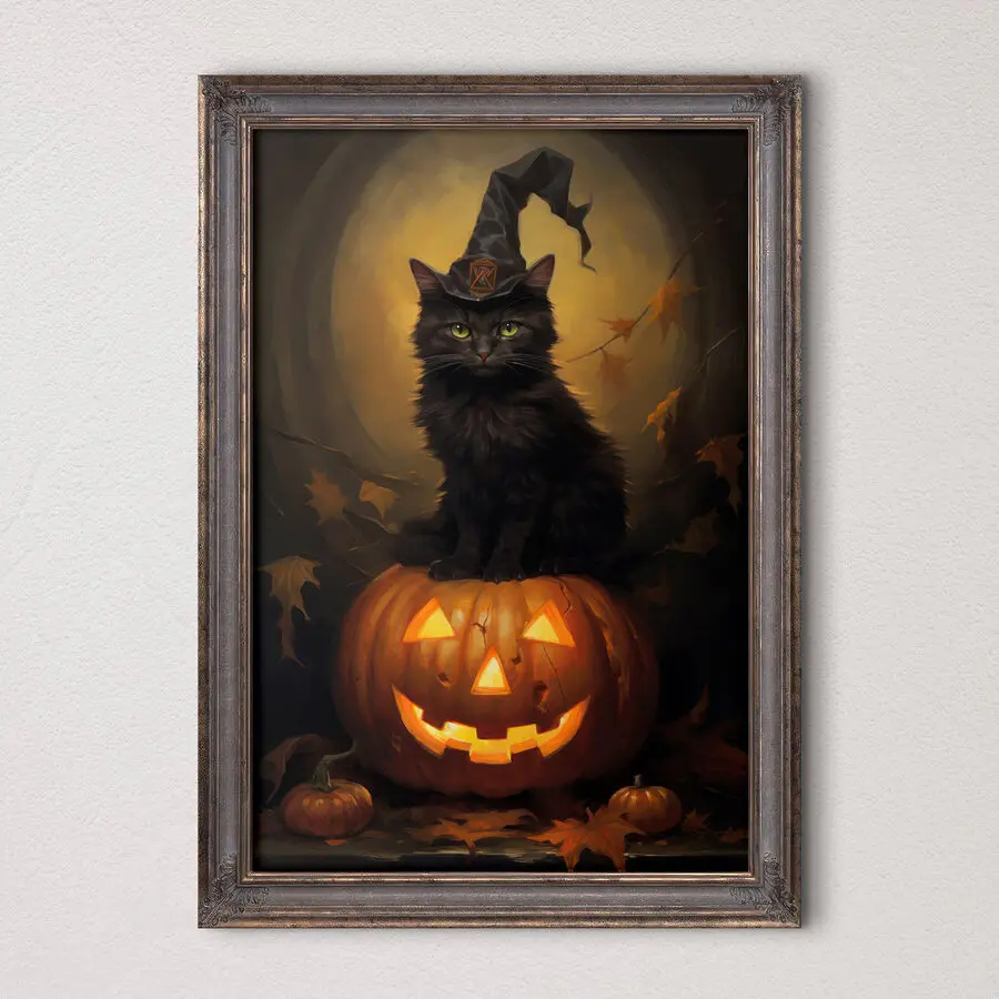Ten kapryśny wydruk na płótnie, przedstawiający kota majestatycznie siedzącego na szczycie świecącej dyni, doda szczyptę magicznego kaprysu do każdego pomieszczenia. Wyobraź sobie tego przebiegłego kota, być może myślącego, że jest królem Halloween, rzucającego czar na twoją przestrzeń życiową. Ciepły blask dyni w połączeniu z czujnym spojrzeniem kota tworzy przytulną, czarującą atmosferę. Idealny dla miłośników zwierząt lub każdego, kto ceni sobie odrobinę humoru i psot w swoim wystroju. Na pewno zachęci do rozmowy!