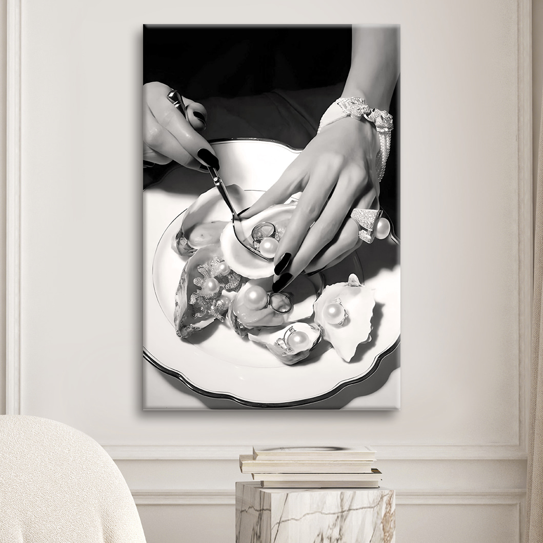 Wyobraź to sobie: stylowe czarno-białe arcydzieło przedstawiające kobietę trzymającą łyżkę i ostrygę – brzmi intrygująco, prawda? Ma ponadczasowy, minimalistyczny urok, który natychmiast ożywi każdą przestrzeń. Idealny do kuchni lub jadalni, szepcze elegancję i tajemnicę.