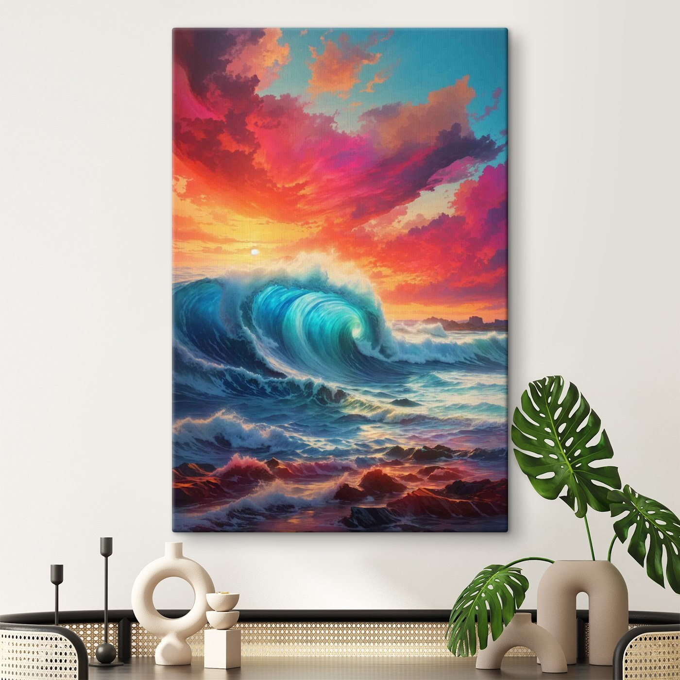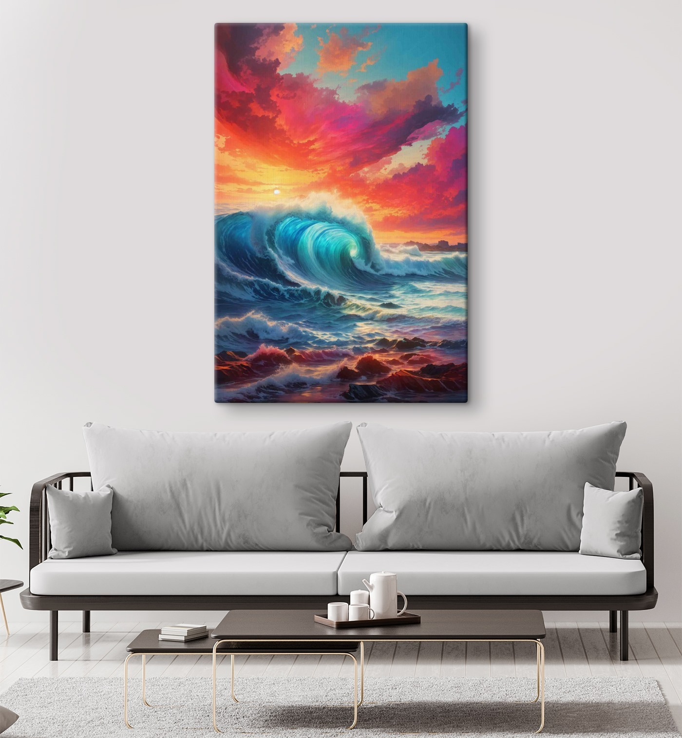 Wyobraź sobie, że budzisz się przy szumie delikatnej oceanicznej bryzy, nawet jeśli znajdujesz się wiele kilometrów od najbliższej plaży. Ten obraz “Large Wave in the Ocean” przenosi to spokojne uczucie wprost do Twojego salonu. Żywe kolory i dramatyczna fala sprawiają, że czujesz radosny pęd morza bez moczenia stóp – całkiem przydatne, aby uniknąć przemoczonych skarpet, prawda? To jak codzienna ucieczka na najbardziej spektakularny pokaz natury. Zawieś go i pozwól oceanowi działać na ciebie uspokajająco.
