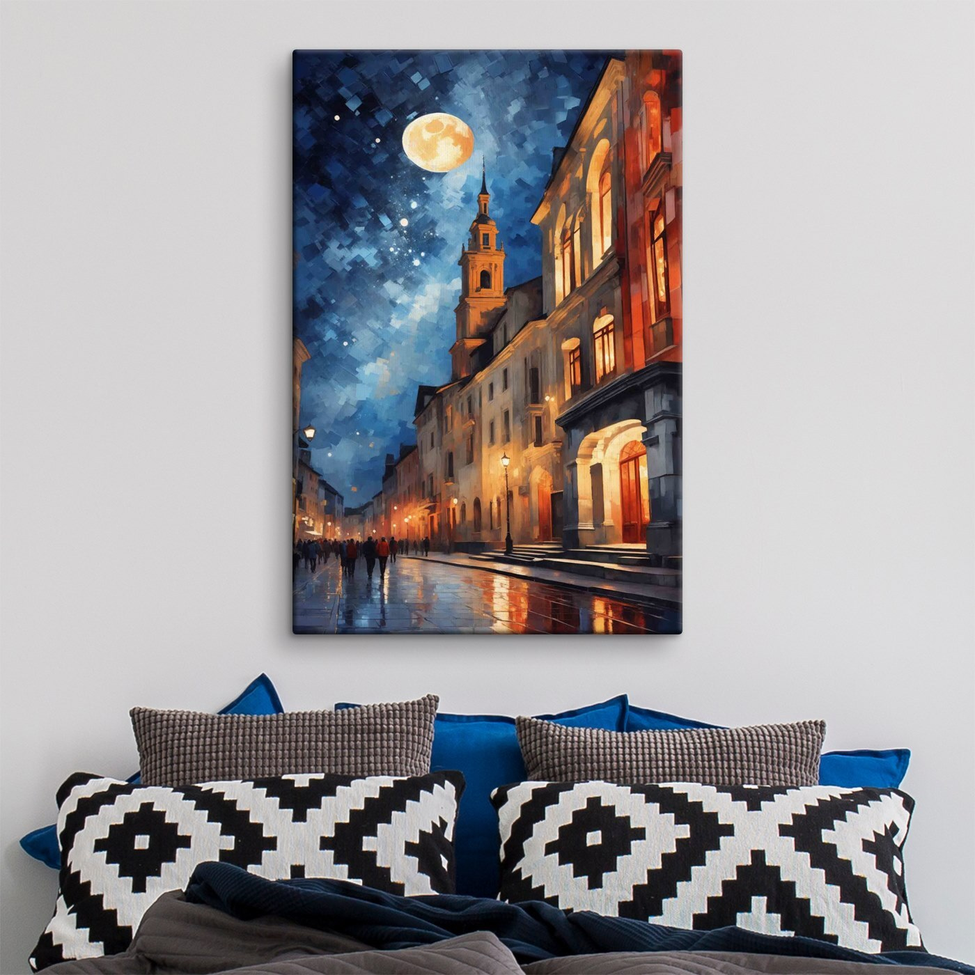 Wkrocz do świata, w którym miasto nigdy nie śpi, a księżyc jest twoim przewodnikiem. Ten obraz na płótnie “Ulica z budynkami i księżycem” przenosi urok nocnych pejzaży miejskich wprost do Twojego salonu. Wyobraź sobie delikatny blask latarni ulicznych odbijających się od bruku, podczas gdy księżyc rzuca swoją magię na zabytkową architekturę. To jak spacer o północy bez opuszczania kanapy. Zmieni to każdą przestrzeń w miejską oazę – romantyczną, mistyczną, odrobinę tajemniczą. Idealny dla tych, którzy marzą o światłach miasta i niekończących się opowieściach.