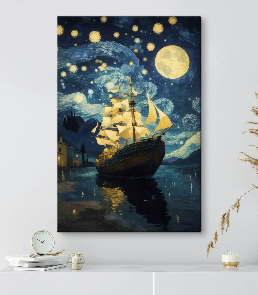 Wyobraź sobie ten wydruk na płótnie – hipnotyzujący statek płynący pod rozgwieżdżonym niebem, wprost w Twoim salonie. To jak migawka przygody, która obiecuje Cię porwać, nawet jeśli właśnie wylegujesz się z filiżanką herbaty. Sposób, w jaki światło księżyca tańczy na wodzie, to czysta magia; wydaje się, że może towarzyszyć temu chłodna, oceaniczna bryza. Idealny do rozbudzania marzeń lub dodawania szczypty wędrówki do dnia. Ponadto jest to świetny początek rozmowy – ktoś z pewnością zapyta, dokąd może popłynąć w następnej kolejności. Absolutnie czarujący!
