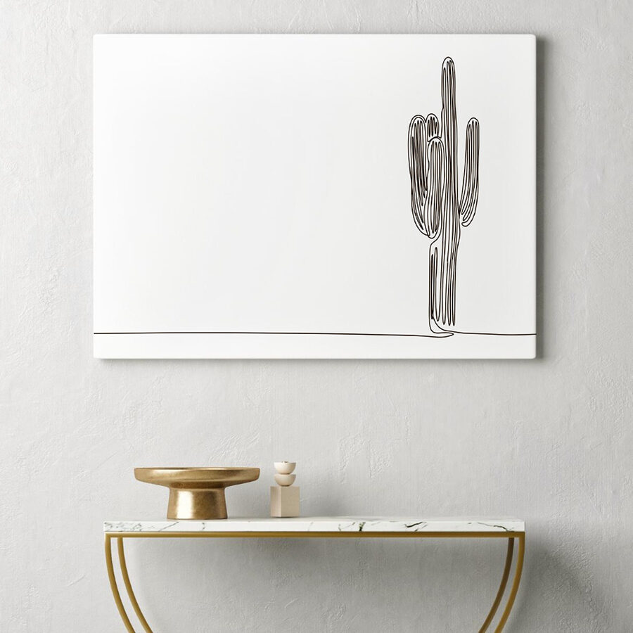 Wyobraź to sobie: kaktus uchwycony w jednej płynnej linii, wnoszący odrobinę dziwacznej elegancji do Twojej przestrzeni. To prostota w najlepszym wydaniu – stylowy ukłon w stronę minimalizmu z odrobiną pustynnego klimatu. Idealny dla tych, którzy kochają odrobinę artystycznego kaprysu na swoich ścianach. Wyobraź sobie, że wisi w Twoim salonie, wzbudzając ciekawość i rozmowy. “Czy to kaktus, czy sztuka nowoczesna?”. To jedno i drugie – balansuje fajne wibracje z nutą odporności natury. Zaufaj mi, to płótno w stylu zen, którego nie wiedziałeś, że potrzebujesz.