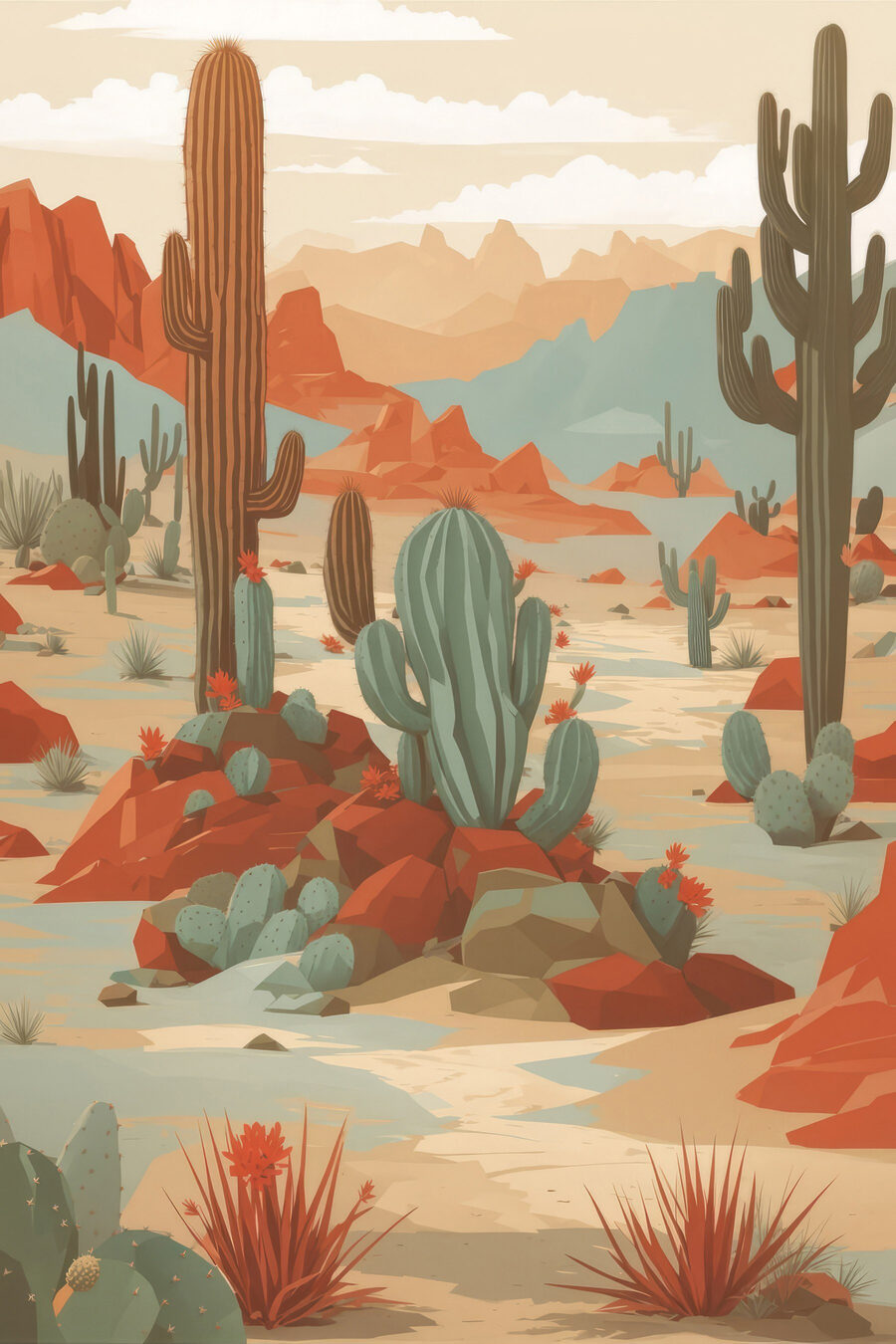 Wyobraź sobie, że wchodzisz do swojego pokoju i natychmiast przenosisz się na rozświetloną słońcem pustynię, gdzie kaktusy stoją wysoko, a skały opowiadają historie o ponadczasowości. Ten obraz na płótnie “Desert Landscape with Cactuses and Rocks” wnosi odrobinę artyzmu natury bezpośrednio na ścianę, dodając klimat, który jest zarówno uspokajający, jak i pełen przygód. To trochę jak posiadanie małej pustynnej oazy, bez palącego upału, ale z zachowaniem surowego uroku. Idealny dla tych, którzy uwielbiają odrobinę dzikiego i cudownego w swoim przytulnym kącie!