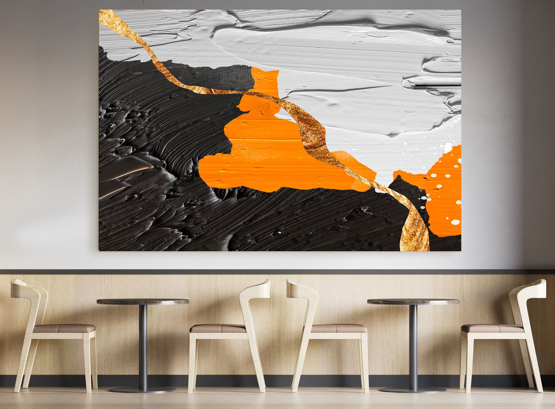 Ten wydruk na płótnie jest jak mała eksplozja energii, łącząca odważną czerń, wyrazistą biel i soczysty pomarańcz w zachwycającym tańcu. Wyobraź sobie, że wisi w przytulnym zakątku lub rozjaśnia salon. To nie tylko sztuka; to początek rozmowy, który może rozpalić iskrę kreatywności w każdym, kto go zobaczy. Warstwy farby tworzą taką zabawną teksturę, prawie tak, jakby sztuka zapraszała do jej dotknięcia. Wyobraź sobie, że popijasz kawę, wpatrujesz się w to dzieło i pozwalasz swojemu umysłowi wędrować – to rodzaj atmosfery, która wnosi ciepło do każdej przestrzeni, jednocześnie sprawiając, że Twoja ściana jest bardziej podobna do Ciebie. Idealny dla tych, którzy szukają wyjątkowego wystroju, który mówi: “Tak, mam styl”.