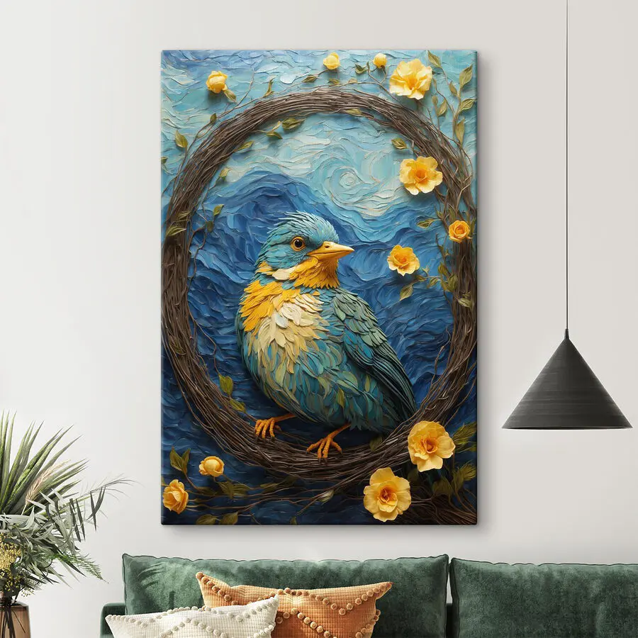 Wyobraź to sobie: uroczy mały ptaszek siedzący w wieńcu, kolory tak żywe, że można by pomyśleć, że właśnie odleciał prosto z płótna. Ten obraz “Bird in a Wreath” nie tylko wisi na ścianie – on śpiewa. Te wirujące błękity i słoneczne żółcie? Praktycznie nucą własną melodię. Idealny dla każdego, kto kocha zwierzęta lub po prostu potrzebuje ożywionej odrobiny sztuki. Kto nie chciałby mieć wesołego, pierzastego strażnika, który czuwa nad nim podczas picia porannej kawy? To tak, jakby mieć wiosnę na zawsze, w domu.
