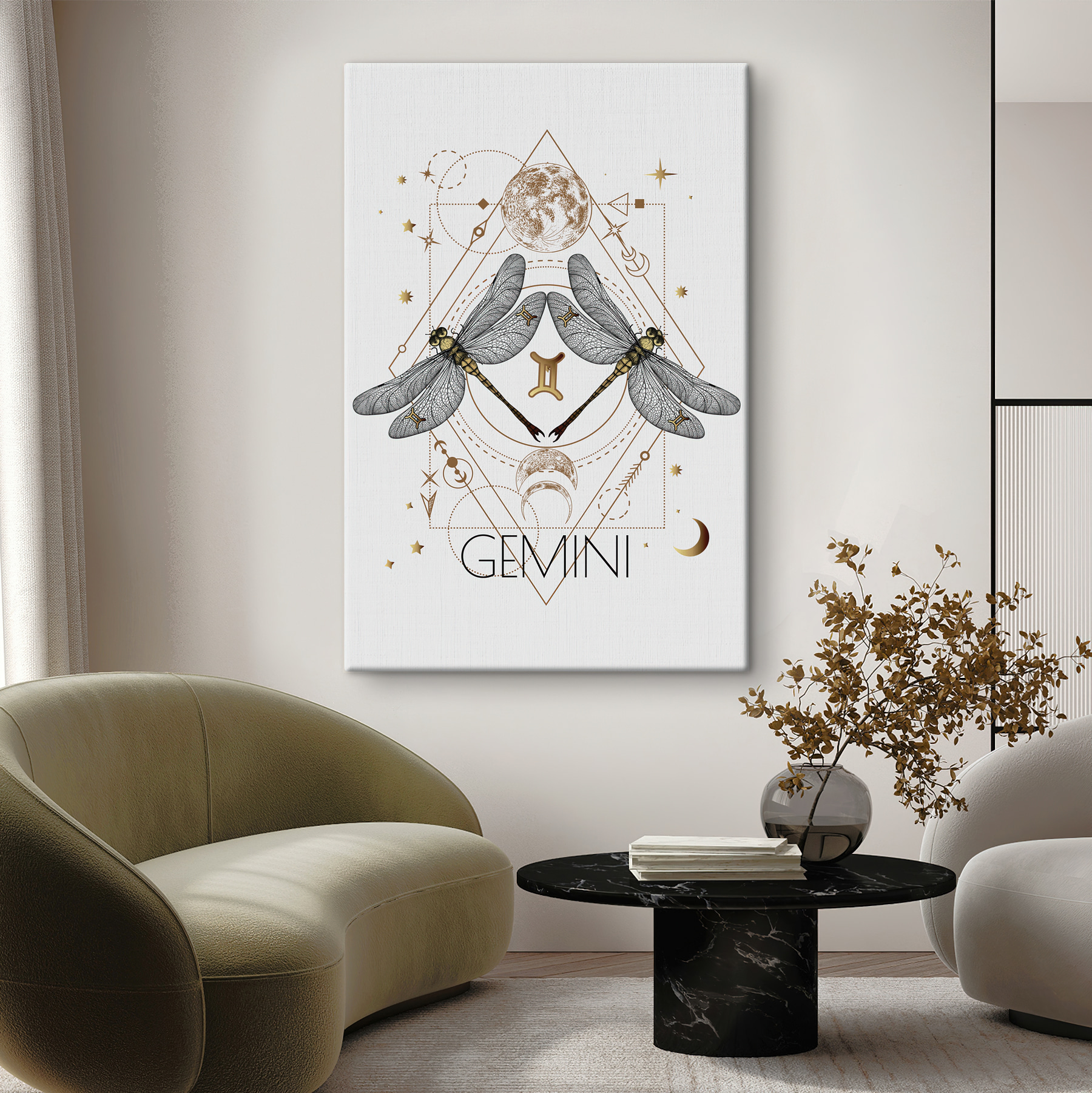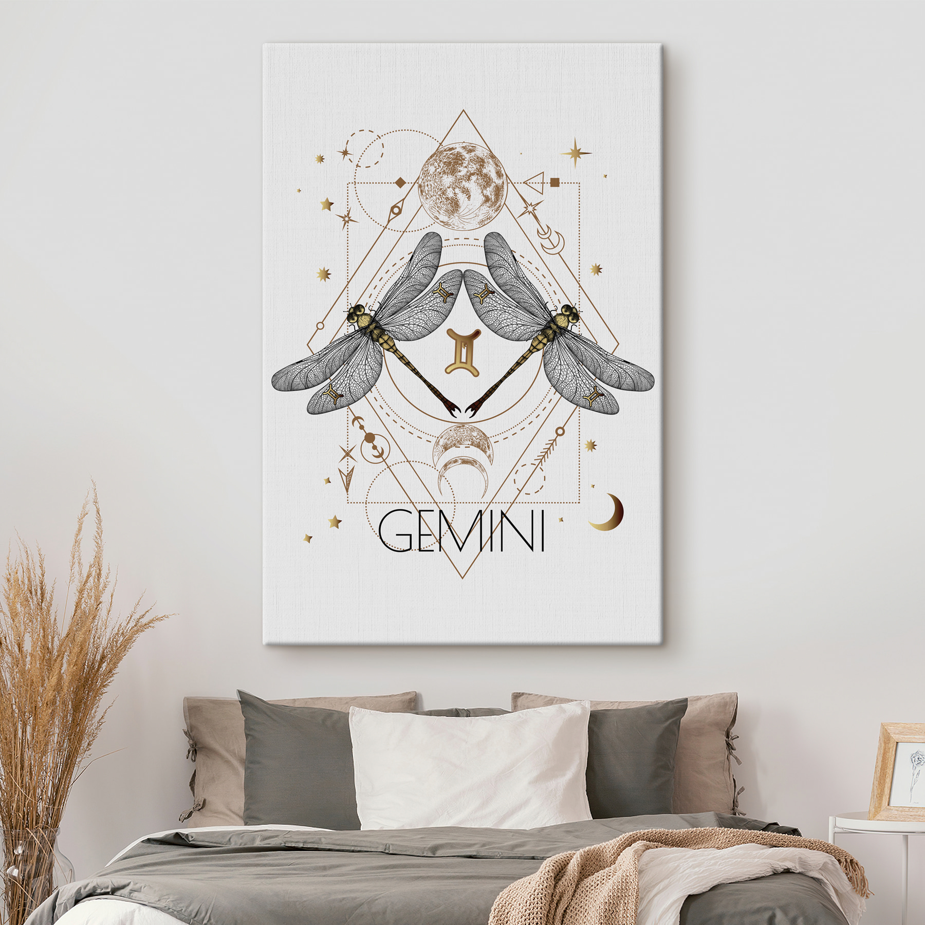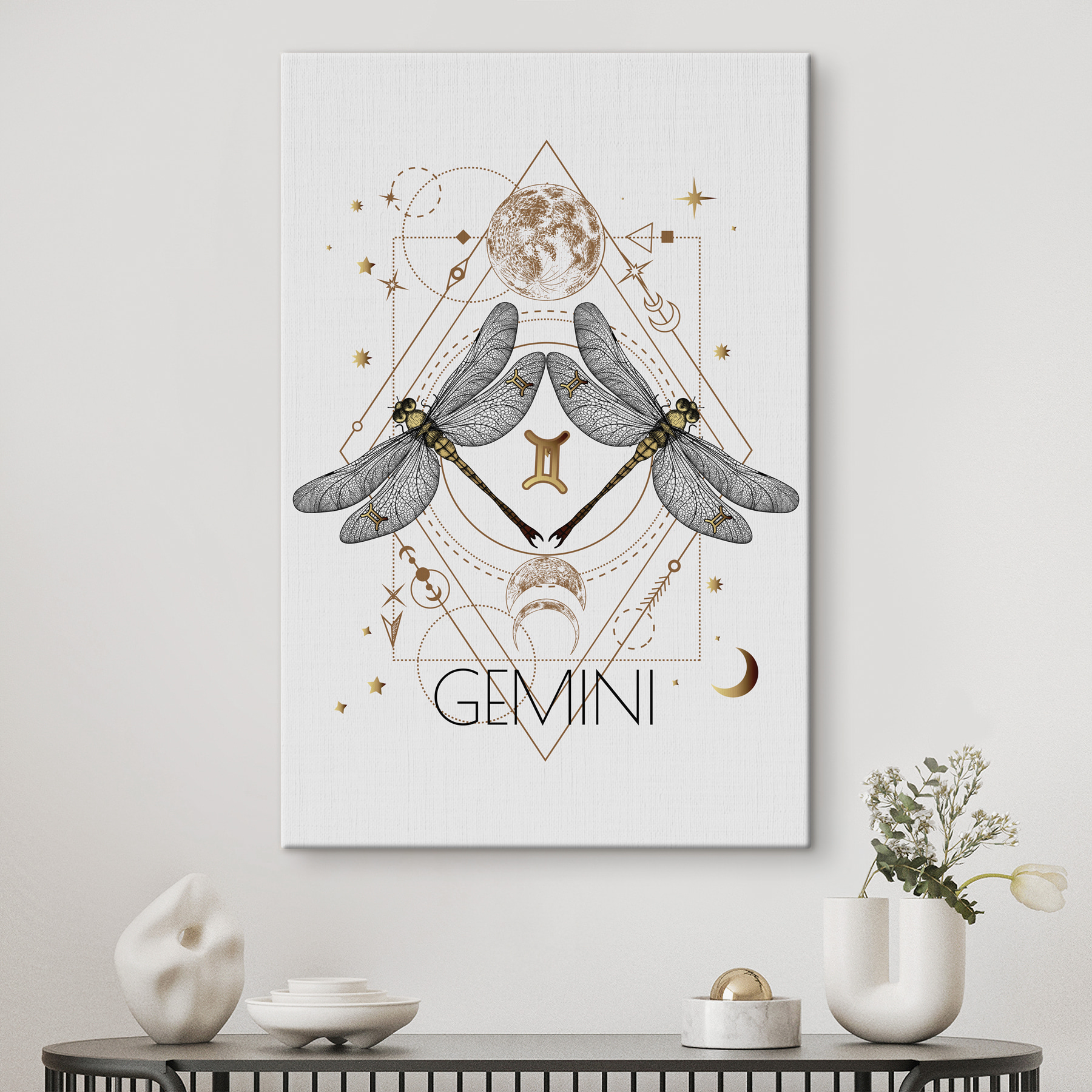 Odmień każdą przestrzeń dzięki temu kapryśnemu obrazowi na płótnie “Ważka ze skrzydłami”. Obraz przedstawiający ważki tańczące wokół niebiańskich symboli jest jak zaproszenie odrobiny natury i mistycyzmu do swojego domu. Wyobraź go sobie nad swoim ulubionym kącikiem do czytania lub inspirującym kącikiem, któremu przydałaby się odrobina osobowości. Delikatne detale wzbudzają ciekawość i zachęcają do rozmowy – znajomi nie omieszkają przyjrzeć się im bliżej. To nie tylko wydruk; to doświadczenie, które tchnie życie w twoje ściany, tworząc idealny klimat zarówno na przytulne noce, jak i słoneczne dni. Idealny dla tych, którzy cenią sobie odrobinę stylu boho lub minimalistycznego uroku!