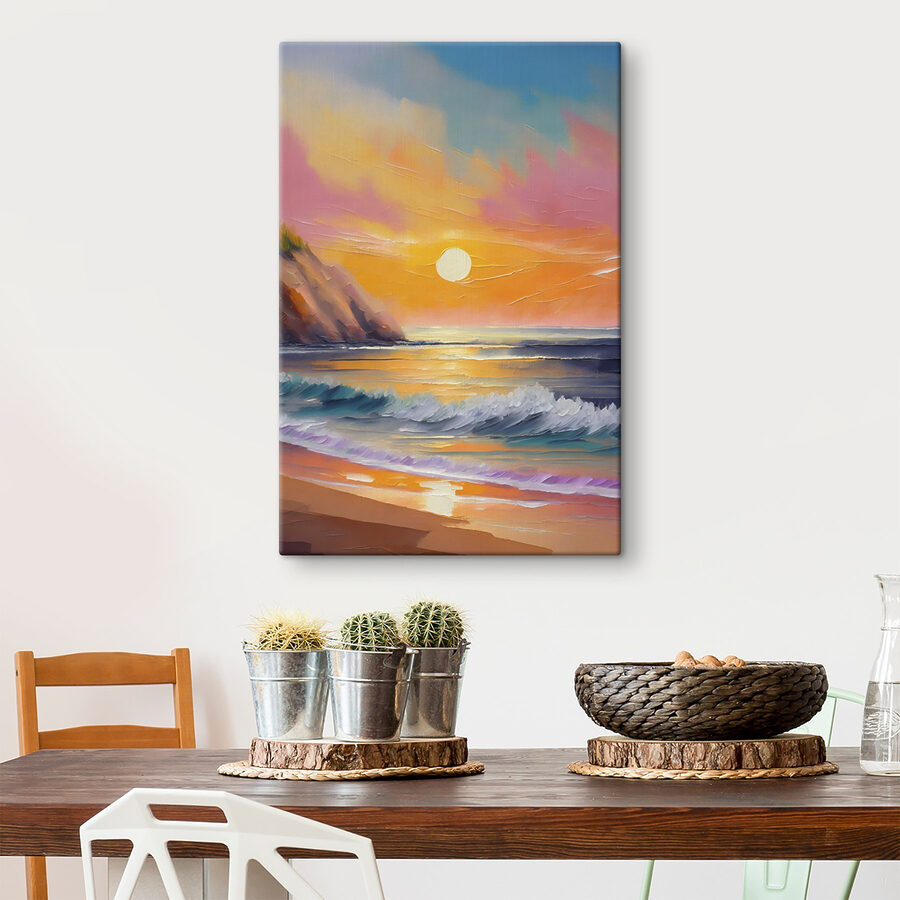 Wyobraź sobie: siedzisz w swoim ulubionym fotelu, popijając ciepłą kawę, a przed tobą wisi zapierające dech w piersiach płótno – fale, wzgórza i wszystkie plażowe wibracje bez piasku utkniętego w niewygodnych miejscach. To dzieło przenosi muzykę oceanu prosto do Twojego salonu. Kolory? Och, to serenada zachodu słońca, ciepła i zachęcająca. Poczujesz się, jakbyś patrzył, jak słońce zanurza się pod horyzontem, a fale szepczą tajemnice, które zna tylko morze. To jak marzenie o wakacjach, bezpośrednio na ścianie.