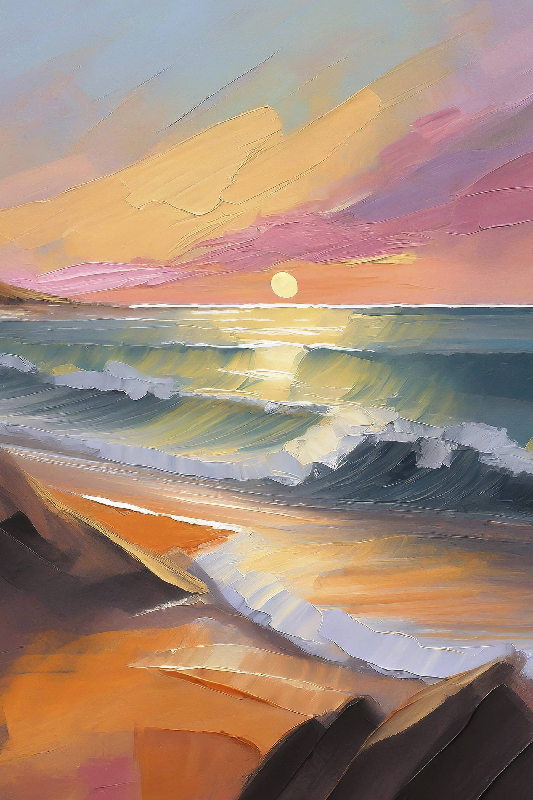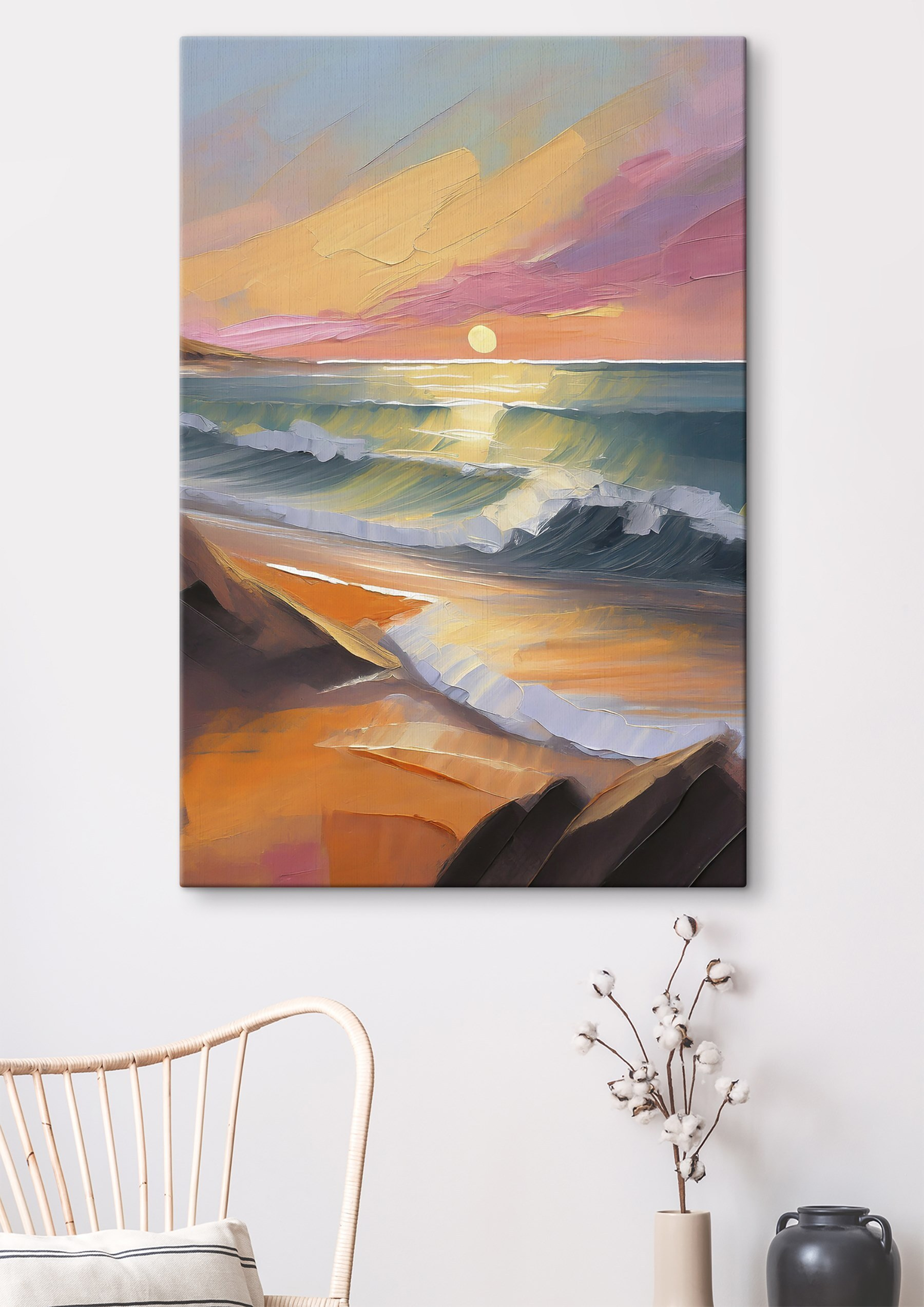 Wyobraź sobie taką sytuację: masz za sobą długi dzień, wygodnie rozsiadasz się w swoim ulubionym fotelu, a tuż przed tobą na ścianie pojawia się czarujące płótno przedstawiające plażę o zachodzie słońca. Te fale, namalowane tak żywymi pociągnięciami, wydają się niemal szeptać tajemnice oceanu. Niebo, eksplozja różów i pomarańczy, sprawia wrażenie fajerwerków natury. To nie tylko sztuka; to mini wakacje. Idealny do stworzenia spokojnej atmosfery, może nawet sprawić, że rośliny domowe poczują się trochę jak na wakacjach. Cały zen, bez piasku w butach!