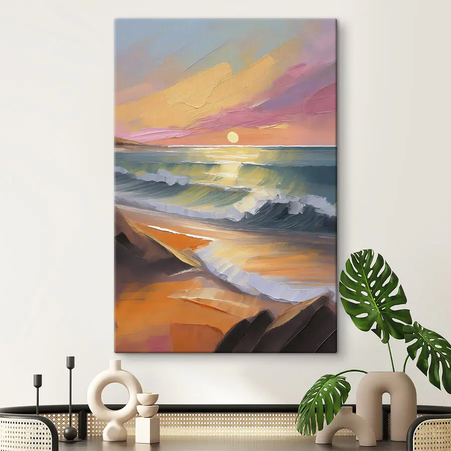 Wyobraź sobie taką sytuację: masz za sobą długi dzień, wygodnie rozsiadasz się w swoim ulubionym fotelu, a tuż przed tobą na ścianie pojawia się czarujące płótno przedstawiające plażę o zachodzie słońca. Te fale, namalowane tak żywymi pociągnięciami, wydają się niemal szeptać tajemnice oceanu. Niebo, eksplozja różów i pomarańczy, sprawia wrażenie fajerwerków natury. To nie tylko sztuka; to mini wakacje. Idealny do stworzenia spokojnej atmosfery, może nawet sprawić, że rośliny domowe poczują się trochę jak na wakacjach. Cały zen, bez piasku w butach!