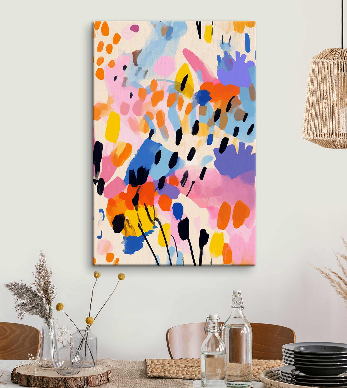 Wyobraź sobie, że umieszczasz to tętniące życiem abstrakcyjne płótno na ścianie – to jak uwolnienie karnawału kolorów w Twojej przestrzeni! Ten żywy wydruk to przede wszystkim plamy i kreski jasnych odcieni, które tańczą razem jak szalona impreza. Idealny do dodania energii, sprawiając, że Twój pokój będzie tryskał kreatywnością. Zabawna mieszanka kształtów i odcieni w jakiś sposób wydaje się spokojna, a jednocześnie chaotyczna – coś w rodzaju zorganizowanego bałaganu, na który po prostu przyjemnie się patrzy. To nie tylko sztuka, to doświadczenie. Niezależnie od tego, czy popijasz kawę, czy po prostu odpoczywasz, będziesz znajdować nowe małe szczegóły, z których będziesz się uśmiechać. Uwielbiasz dobry początek rozmowy? To płótno sprawi, że ludzie będą rozmawiać – to odrobina radosnych wibracji, idealna dla każdego, kto lubi odrobinę nieoczekiwanego w swoim wystroju.