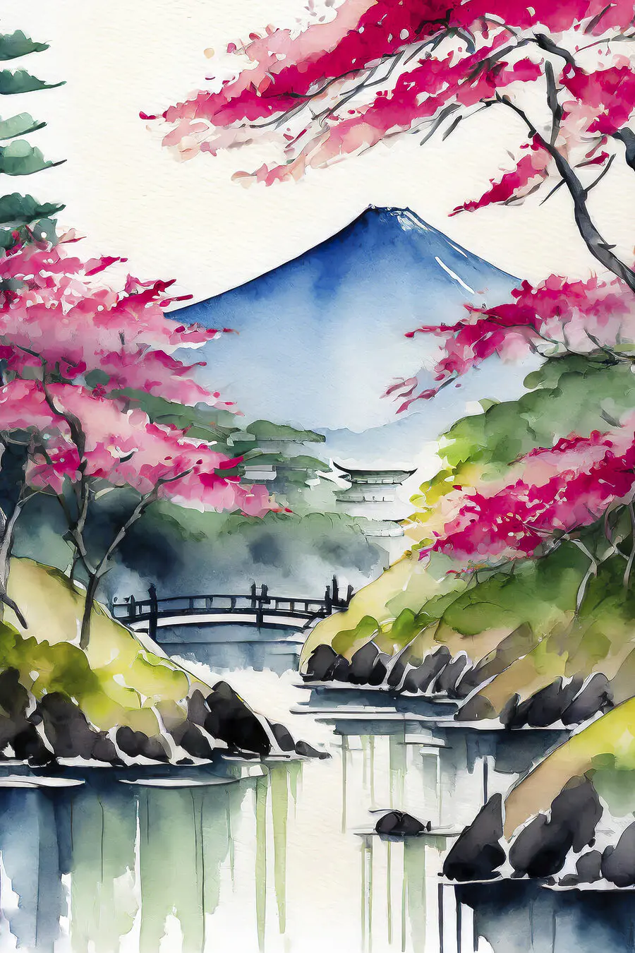 Przenieś kawałek natury do wnętrza dzięki tej uroczej akwareli przedstawiającej góry i kwitnące różowe drzewa. To tak, jakby mieć mini ucieczkę bezpośrednio na ścianie, wzywającą do leniwych popołudni i marzeń. Wyobraź sobie, że popijasz herbatę, wpatrujesz się w tę piękną scenę i pozwalasz, by łagodne kolory spływały na ciebie.
