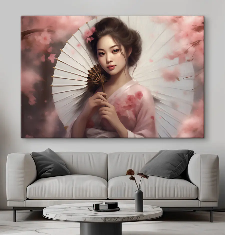 Wyobraź sobie, że wchodzisz do pokoju i jesteś witany przez pogodne piękno kobiety z parasolem, otoczonej delikatnymi kwiatami. Ten wydruk na płótnie oddaje moment, który szepcze wiosenne popołudnia i delikatne bryzy. To jak mała ucieczka do japońskiego ogrodu w Twoim domu. Wyobraź go sobie nad przytulnym kącikiem do czytania lub jako element dekoracyjny w salonie, inspirujący do marzeń o spokojnych krajobrazach. Delikatne kolory i wdzięczne linie zachęcają do ciepła, sprawiając, że czujesz się jak stary przyjaciel. Idealny dla każdego, kto ceni sobie odrobinę elegancji i kaprysu. To nie tylko sztuka; to nastrój, miłe małe przypomnienie, aby zwolnić i cieszyć się delikatnymi chwilami życia.