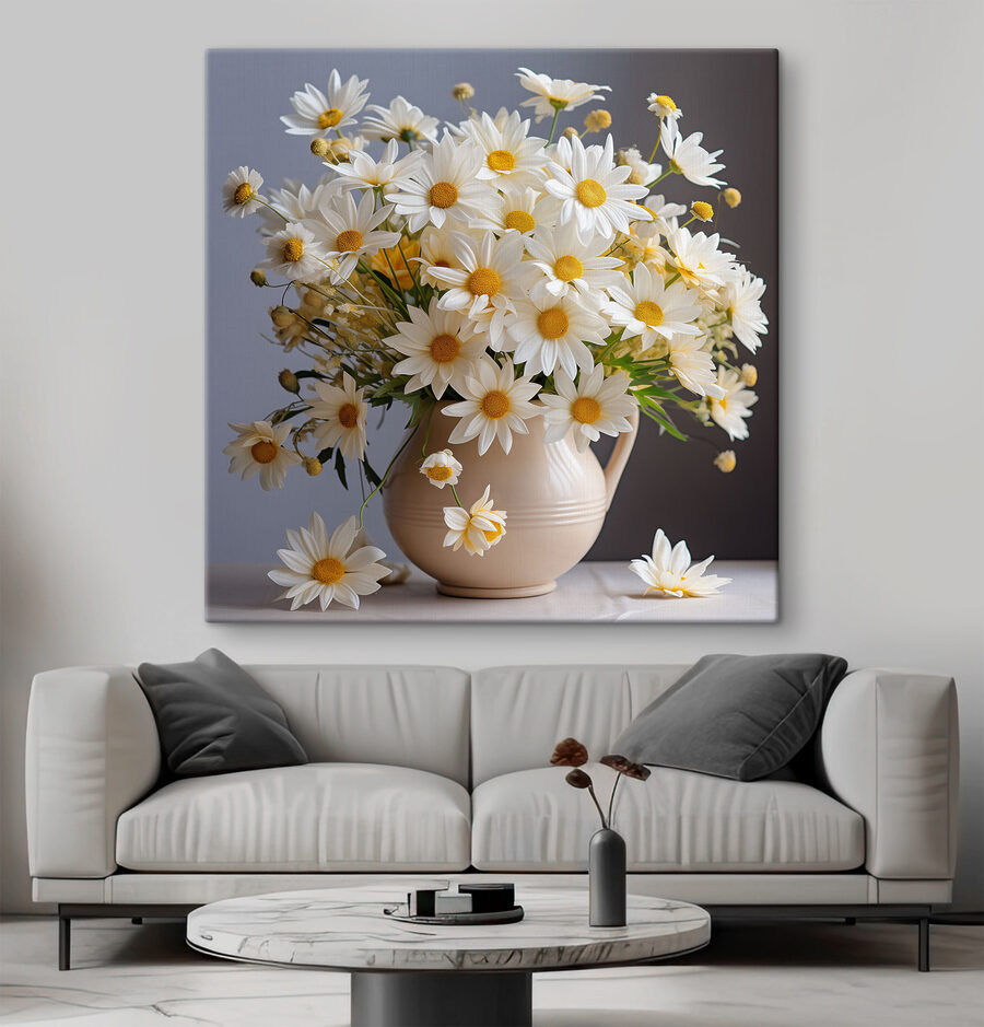 Rozjaśnij swoją przestrzeń dzięki temu wspaniałemu drukowi na płótnie przedstawiającemu kwitnące stokrotki w uroczym ceramicznym wazonie. To jak wybuch słońca, prosto na twoją ścianę! Wyobraź sobie, że wchodzisz do pokoju i od razu czujesz radosną atmosferę, jakbyś właśnie spacerował po rozświetlonym słońcem ogrodzie. Zabawny taniec płatków i żywe kolory zachęcają do uśmiechu i ciepła, dzięki czemu idealnie nadają się do każdego zakątka potrzebującego odrobiny życia. To nie tylko dekoracja; to początek rozmowy, mały kawałek natury, który nigdy nie więdnie. Kto nie chciałby poczuć odrobiny tej codziennej radości? Odmień swoje ściany i pozwól stokrotkom zdziałać swoją magię!