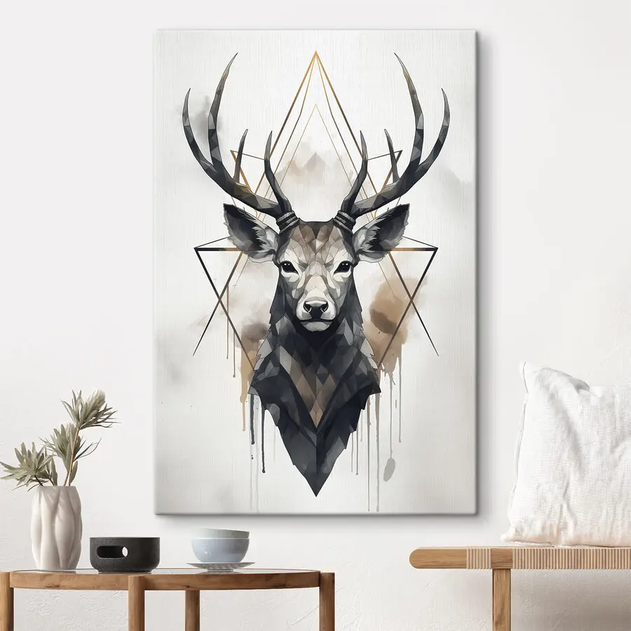 Sprawdź ten wydruk na płótnie “Geometric Stag”! Czyż nie jest oszałamiający? Ten obraz łączy w sobie majestat jelenia z eleganckim, nowoczesnym designem. Wyobraź go sobie w swoim salonie, dodając mu charakteru i odrobiny dzikiego wyrafinowania. Czyste linie i geometryczne kształty nadają mu współczesny charakter, idealny dla każdego, kto lubi minimalistyczny klimat (ale nie jest zbyt zimny lub sterylny, wiesz?).