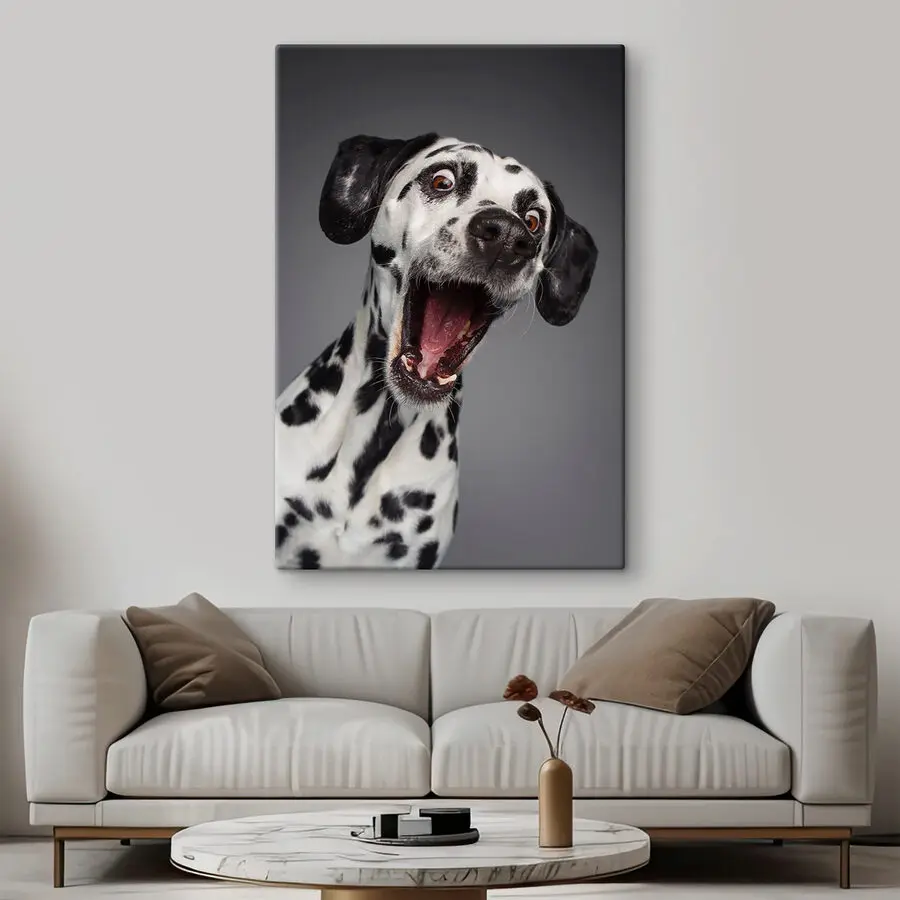 Wyobraź sobie, że wchodzisz do swojego pokoju i zostajesz powitany przez tego uroczego dalmatyńczyka z szeroko otwartymi oczami i zabawnie zaskoczonym wyrazem twarzy na wydruku na płótnie. To jak uchwycenie chwili czystego psiego dramatu, który wywoła uśmiech na twarzy każdego. Idealny dla tych, którzy kochają odrobinę kaprysu w swoim wystroju. Ten obraz wniesie radosny i zabawny nastrój do każdej przestrzeni – tak jakby Twój pupil właśnie usłyszał słowo “spacer” lub zauważył niespodziewany smakołyk!