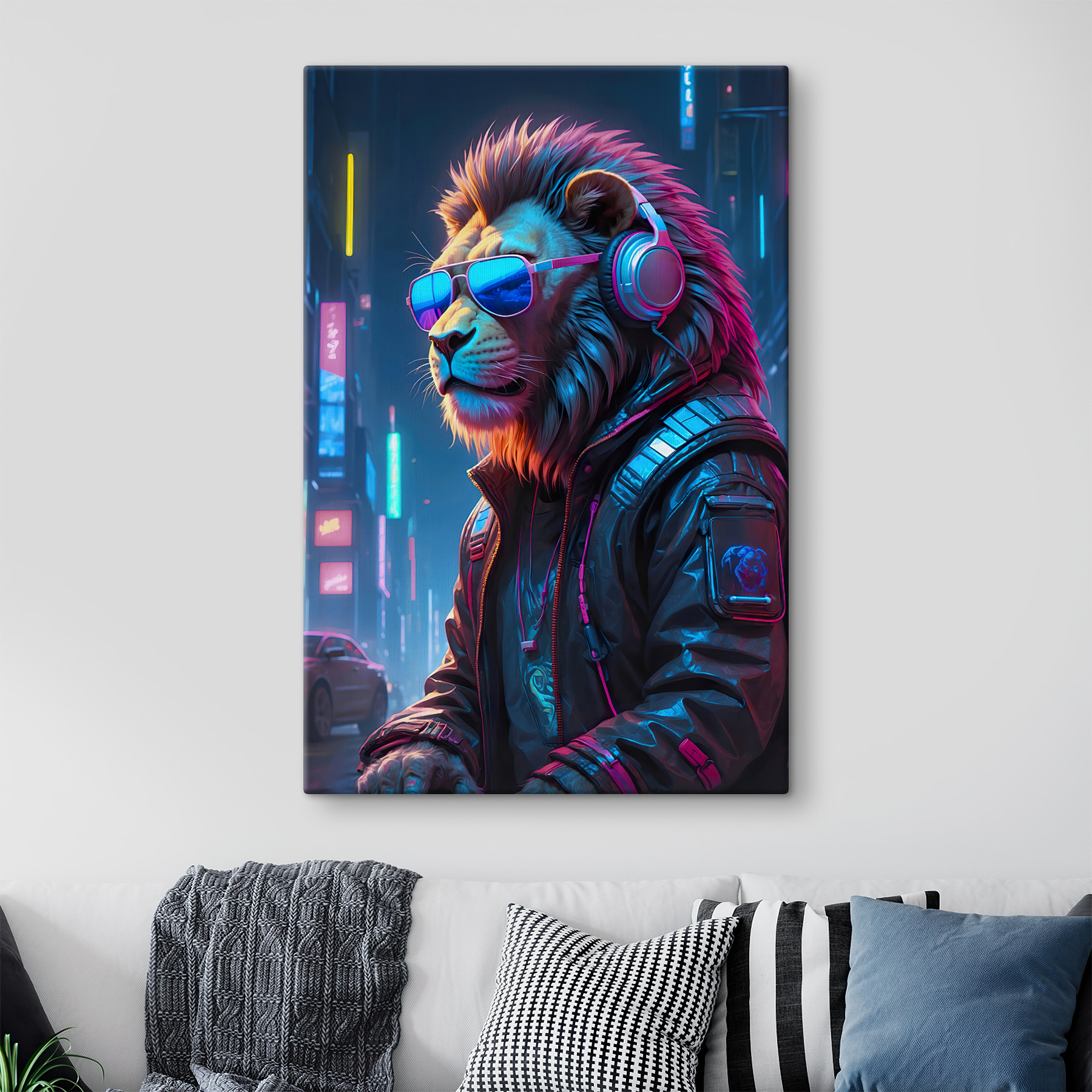 Widziałeś kiedyś tak fajnego lwa? Ten wydruk na płótnie przedstawiający lwa w okularach i słuchawkach jest po prostu zbyt fajny, by mu się oprzeć. Wyobraź sobie, że wchodzisz do pokoju i bum! Ta królewska bestia swobodnie kołysze się w eleganckim miejskim sprzęcie – to tak, jakby król dżungli stał się DJ-em w twoim salonie. Neonowe kolory sprawiają, że jest to idealne dzieło dla każdego, kto kocha wyjątkową, przyciągającą wzrok sztukę. Ma ten chłodny, nocny miejski klimat, który może całkowicie urozmaicić nudną ścianę. Poza tym, kto nie uśmiechnąłby się widząc tak zabawnego lwa na co dzień? To także świetny element do rozmów!