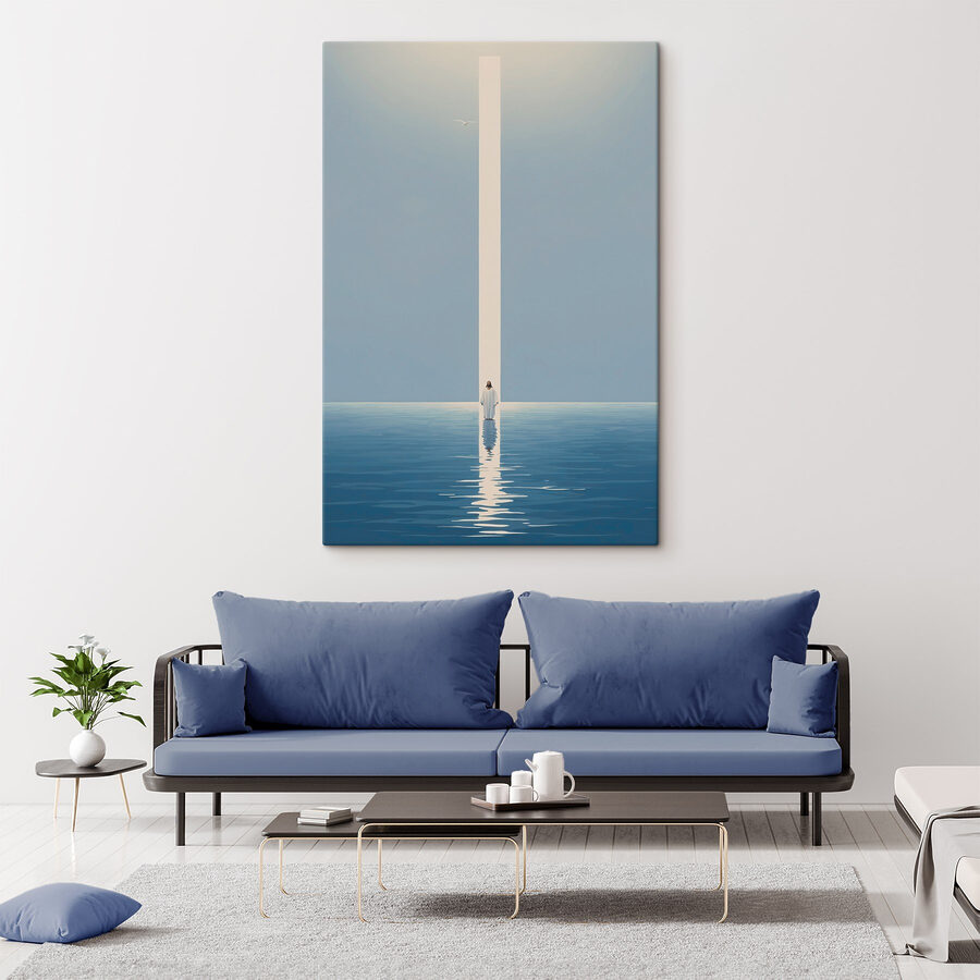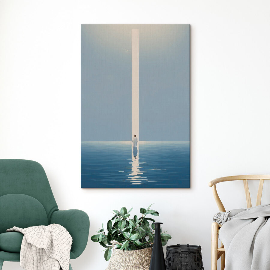 Ten wydruk na płótnie przedstawia spokojną postać w białej szacie, stojącą pośród spokojnych wód. To jak mały kawałek spokoju na ścianie. Wyobraź to sobie: słońce właśnie zaglądające za horyzont, delikatny blask tańczący w wodzie i delikatna bryza szepcząca w pokoju. Przynosi poczucie spokoju i refleksji – idealne na te chwile, kiedy życie staje się nieco zbyt głośne. Ta grafika nie tylko dekoruje; zachęca do zatrzymania się, oddechu, a może nawet znalezienia odrobiny jasności w chaosie. Potraktuj ją jako codzienne przypomnienie, że spokój jest zawsze w zasięgu ręki.