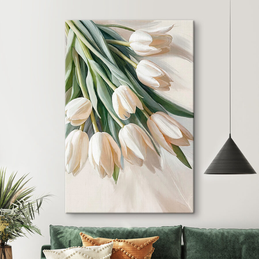 Czy kiedykolwiek miałeś jeden z tych dni, kiedy po prostu potrzebowałeś delikatnego dotyku natury w swojej przestrzeni? Ten druk na płótnie z białymi tulipanami na delikatnym, stonowanym tle jest jak powiew świeżego powietrza na ścianach. Ma piękny, uspokajający klimat – idealny do przytulnego salonu lub sypialni inspirowanej zen. Wyobraź sobie, że każdego ranka budzisz się w otoczeniu eleganckich kwiatów – to małe przypomnienie, by zwolnić i docenić otaczające nas piękno. Delikatna biel i zieleń tak dobrze się komponują, promieniując spokojem i elegancją bez krzyku o uwagę. Poza tym, kto nie kocha tulipanów? Są jak fajne dzieci świata kwiatów, zawsze w modzie, ale nigdy zbyt krzykliwe. Powieś ten obraz i pozwól magii tulipanów zadziałać – wnosząc do domu odrobinę sztuki, natury i kwiatowej radości.