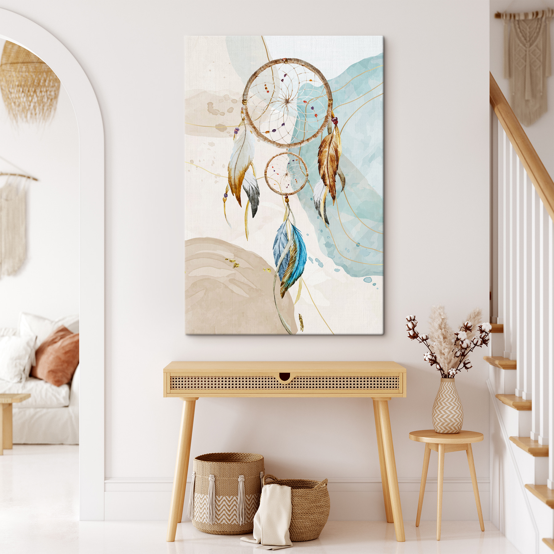 Przekształć swoją przestrzeń w przytulny azyl dzięki temu czarującemu drukowi na płótnie przedstawiającemu łapacz snów. Wyobraź sobie, że wisi bez wysiłku na ścianie, zapraszając dobre wibracje i słodkie sny, dodając jednocześnie odrobinę artystycznego uroku. Akwarelowy wzór tańczy z miękkimi odcieniami, a delikatne pióra wydają się niemal gotowe do trzepotania na delikatnym wietrze. Wyobraź sobie, że zwijasz się na kanapie z ciepłym napojem, wpatrując się w to dzieło sztuki i czujesz, jak ciężar zmartwień znika. To nie tylko dekoracja; to mały kawałek spokoju, który szepcze: “Zrelaksuj się, masz to”. Idealny do salonu lub sypialni, jest jak delikatny uścisk dla twojego domu.