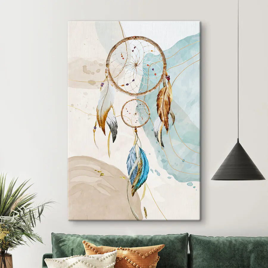Przekształć swoją przestrzeń w przytulny azyl dzięki temu czarującemu drukowi na płótnie przedstawiającemu łapacz snów. Wyobraź sobie, że wisi bez wysiłku na ścianie, zapraszając dobre wibracje i słodkie sny, dodając jednocześnie odrobinę artystycznego uroku. Akwarelowy wzór tańczy z miękkimi odcieniami, a delikatne pióra wydają się niemal gotowe do trzepotania na delikatnym wietrze. Wyobraź sobie, że zwijasz się na kanapie z ciepłym napojem, wpatrując się w to dzieło sztuki i czujesz, jak ciężar zmartwień znika. To nie tylko dekoracja; to mały kawałek spokoju, który szepcze: “Zrelaksuj się, masz to”. Idealny do salonu lub sypialni, jest jak delikatny uścisk dla twojego domu.