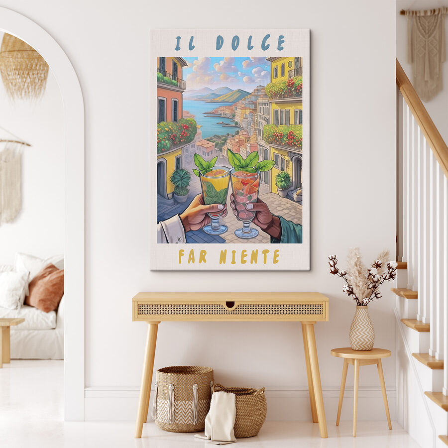 Wyobraź sobie: wylegujesz się z ulubionym drinkiem w dłoni, z widokiem na kolorową śródziemnomorską wioskę. Tak właśnie wygląda obraz na płótnie “Hand holding a glass”, który ożywi Twoją ścianę. To jak mini-wakacje, na które nie musisz się pakować! Dzięki tętniącym życiem krajobrazom miejskim i orzeźwiającym napojom z przodu i na środku, czujesz się, jakbyś tam był, chłonąc “dolce far niente” – słodycz nicnierobienia. Idealny do dodania odrobiny koloru i nutki wędrówki do każdego pomieszczenia, od przytulnych kuchni po tętniące życiem salony. To jak słoneczny wypad bez wychodzenia z domu! 🍹🌞