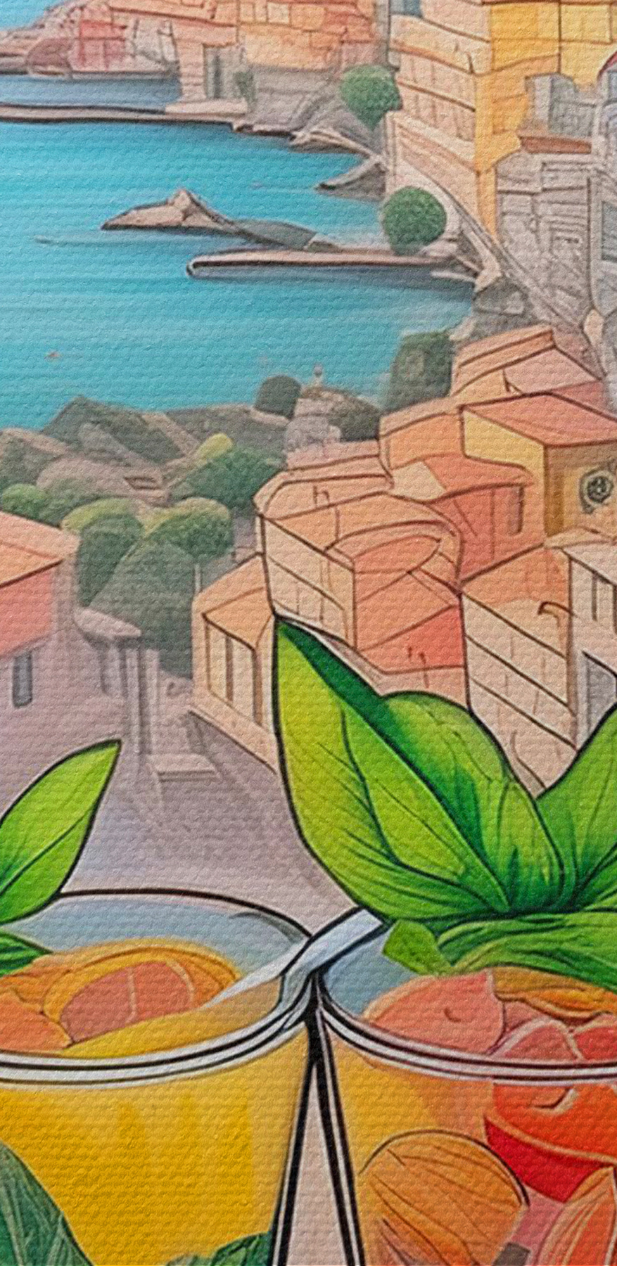 Wyobraź sobie: wylegujesz się z ulubionym drinkiem w dłoni, z widokiem na kolorową śródziemnomorską wioskę. Tak właśnie wygląda obraz na płótnie “Hand holding a glass”, który ożywi Twoją ścianę. To jak mini-wakacje, na które nie musisz się pakować! Dzięki tętniącym życiem krajobrazom miejskim i orzeźwiającym napojom z przodu i na środku, czujesz się, jakbyś tam był, chłonąc “dolce far niente” – słodycz nicnierobienia. Idealny do dodania odrobiny koloru i nutki wędrówki do każdego pomieszczenia, od przytulnych kuchni po tętniące życiem salony. To jak słoneczny wypad bez wychodzenia z domu! 🍹🌞