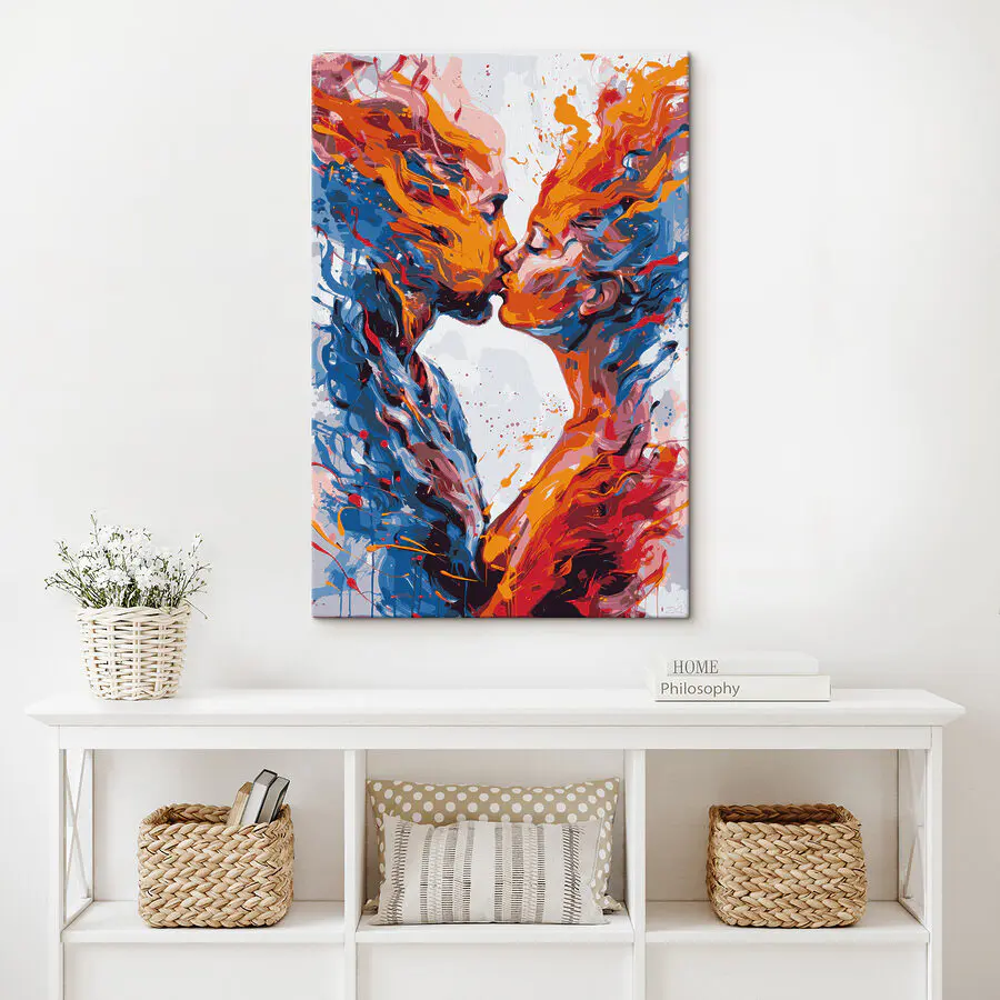 Wyobraź sobie, że wchodzisz do swojego salonu i twój wzrok pada na ten wspaniały obraz na płótnie przedstawiający całujących się mężczyznę i kobietę. Kolory są dzikie i żywe, jak pokaz fajerwerków uchwycony na płótnie. Ma ten niesamowity abstrakcyjny klimat, ale natychmiast czujesz emocje w tym momencie. Niezależnie od tego, czy jesteś romantykiem w sercu, czy kochasz intrygującą sztukę abstrakcyjną, ten obraz mówi tak wiele bez wypowiadania ani jednego słowa. Połączenie ognistej czerwieni i uspokajającego błękitu może nadać ton całemu pomieszczeniu – mieszance pasji i spokoju. Idealny na te dni, kiedy potrzebujesz odrobiny koloru, aby ożywić swoją przestrzeń lub na przytulne noce, kiedy sztuka wydaje się otulać cię w uścisku. Jest to początek rozmowy, podnoszący nastrój i element, który bez wysiłku zamienia każdą ścianę w arcydzieło. Poza tym, kto nie kocha odrobiny romantyzmu w swoim wystroju?