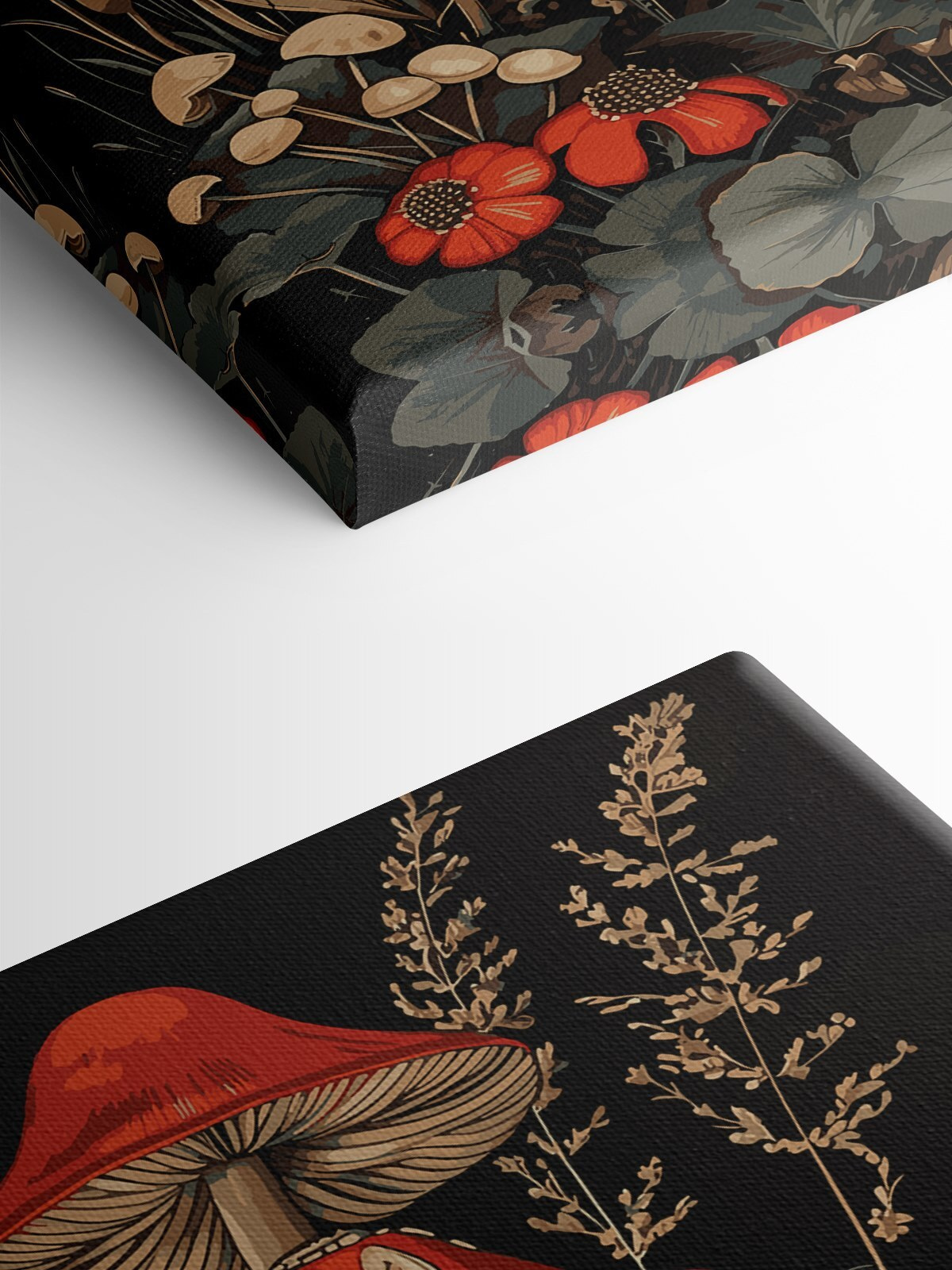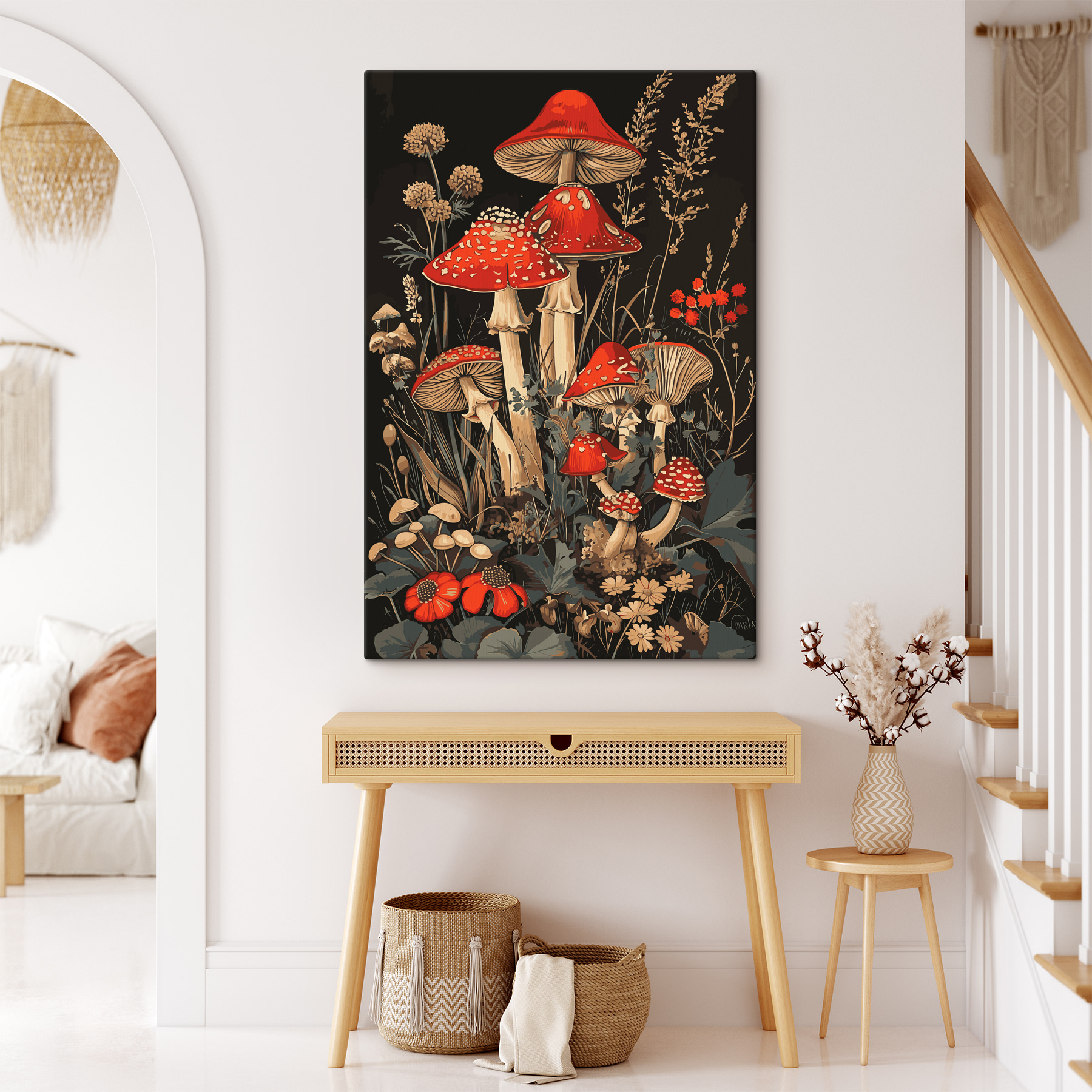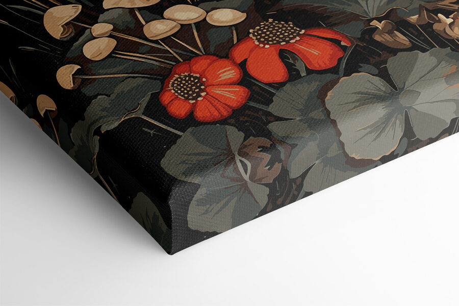 Wyobraź sobie, że dodajesz odrobinę leśnej magii do swojego domu dzięki temu uroczemu drukowi na płótnie przedstawiającemu grzyby z czerwoną czapeczką w otoczeniu kwiatów. Idealny dla miłośników przyrody i osób o kapryśnym sercu, ten obraz oddaje osobliwy, przytulny klimat zaczarowanego lasu. Czy nie możesz sobie wyobrazić, jak rozjaśnia kącik kuchenny lub kącik do czytania? Bogate, ziemiste odcienie i żywe odcienie czerwieni sprawiają, że czujesz się, jakbyś właśnie natknął się na sekretny ogród. Niech ta grafika wniesie odrobinę baśniowego cudu do twojego codziennego życia!