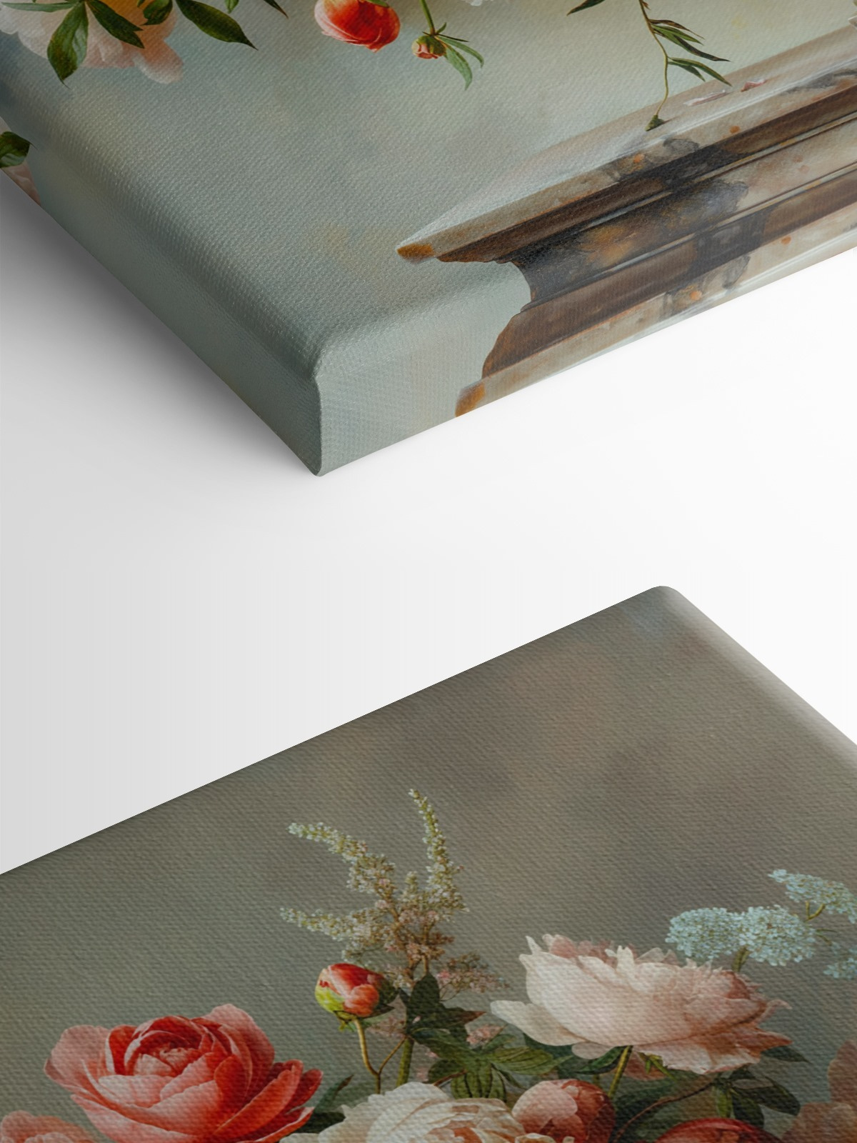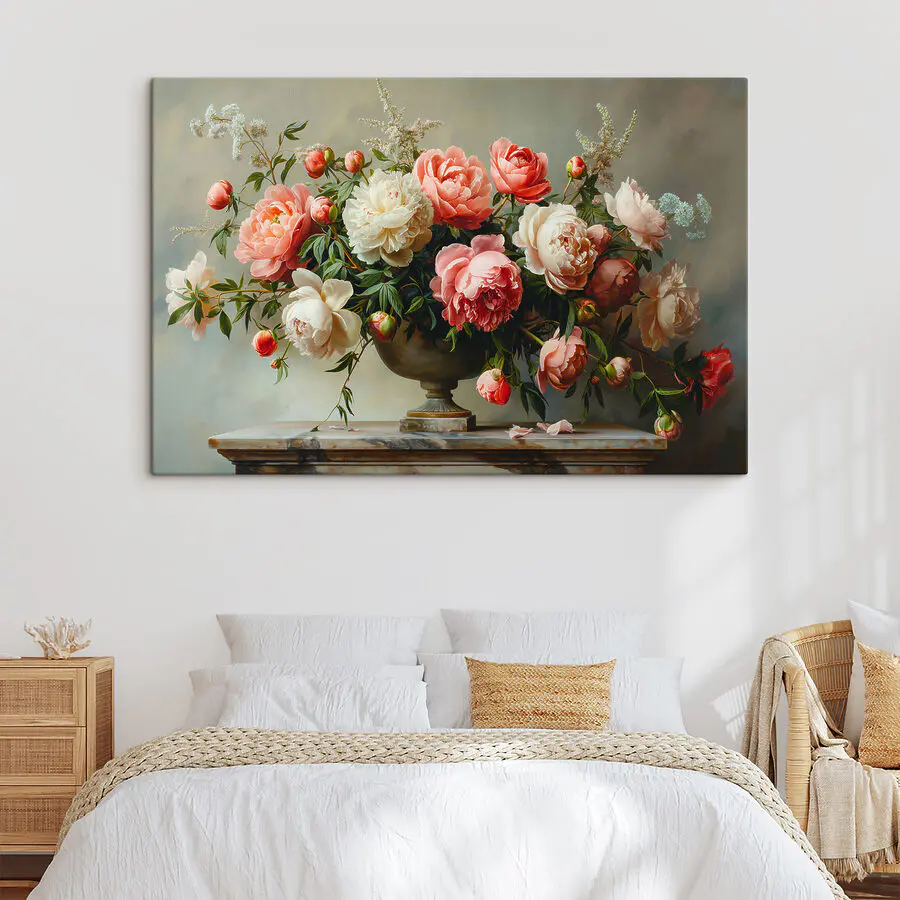 Bogate, klasyczne wibracje wazonu i delikatne kwiaty w delikatnych różach i bieli po prostu pięknie ze sobą współgrają. Ma ten ponadczasowy urok, który pasuje do każdego stylu wystroju. Fantazyjny lub przytulny, będzie dobrze pasował. Ponadto znajduje się w kategoriach Fine Art, Flowers i Popular Canvas Art. Co ma sens, prawda? Ponieważ zdecydowanie przyciąga tłumy.