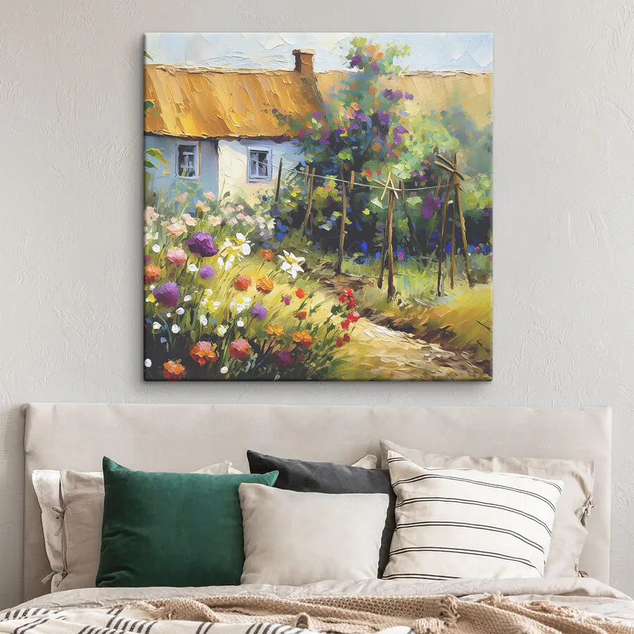Sprawdź “Wydruki na płótnie Ogród Cottage kwitnie w słońcu”! To jak senny spacer po uroczym wiejskim ogrodzie, gdzie kwiaty tańczą w słońcu – urzekające, prawda? Idealny dla każdego, kto kocha sztukę z nutą natury, ten obraz wnosi żywe kwiaty i rustykalny urok do Twojej przestrzeni. Wyobraź sobie, że wracasz do domu po długim dniu i witają cię te radosne kwiaty – natychmiastowa poprawa nastroju! Ten nadruk pasuje do każdego stylu, niezależnie od tego, czy jest to przytulny kącik, czy elegancki salon. To nie tylko sztuka; to mały kawałek spokoju i radości. Świetnie nadaje się do stworzenia spokojnego kącika lub przytulnego akcentu w wystroju. Szczypta kaprysu, szczypta jasności – ta grafika ma wszystko. Jest jak przytulanka na ścianie!