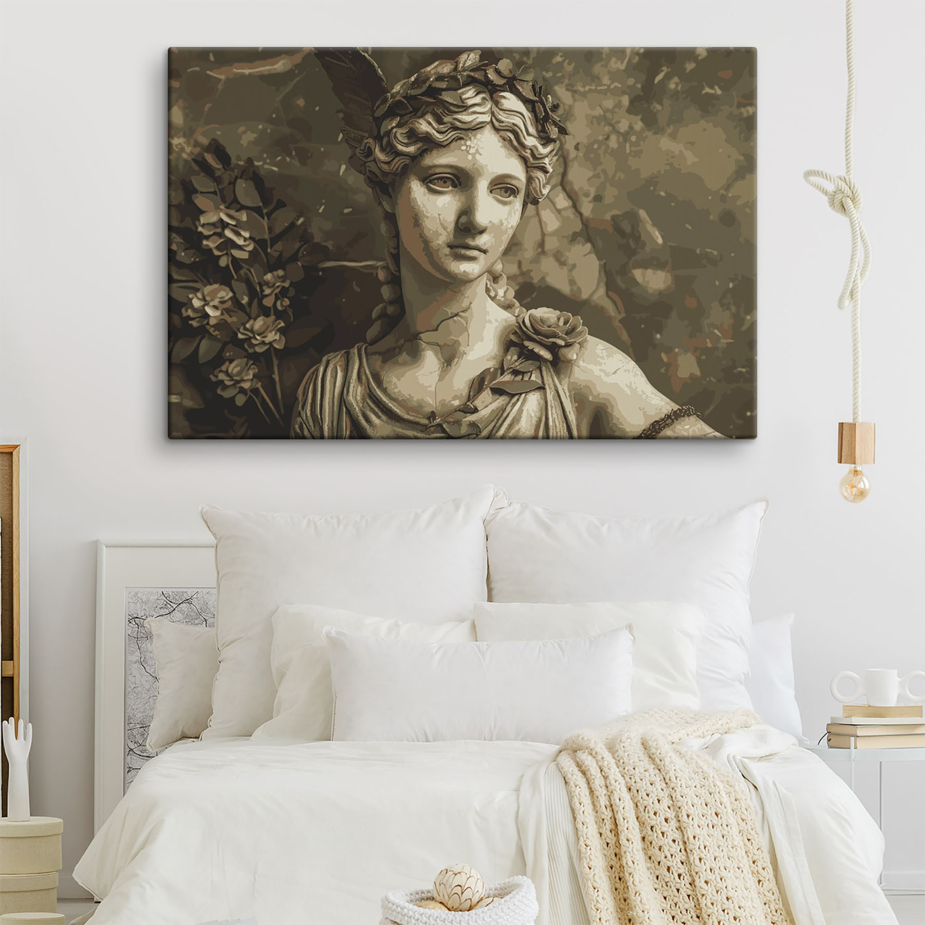 Odmień swoją przestrzeń dzięki temu efektownemu obrazowi na płótnie przedstawiającemu pełną wdzięku kobietę z piórami we włosach. To jak delikatny szept elegancji bezpośrednio na ścianie! Miękkie, stonowane odcienie wywołują poczucie spokoju, idealne do przytulnego kącika do czytania lub stylowej jadalni. Wyobraź sobie, że zatrzymujesz się, by podziwiać ją podczas przerwy na kawę, pozwalając umysłowi wędrować do historii kryjących się za jej spokojnym spojrzeniem. Ponadto z pewnością wywoła intrygujące rozmowy z gośćmi – “Jak myślisz, o czym ona myśli?”. Kto wie – może po prostu zainspiruje do kreatywnych marzeń!