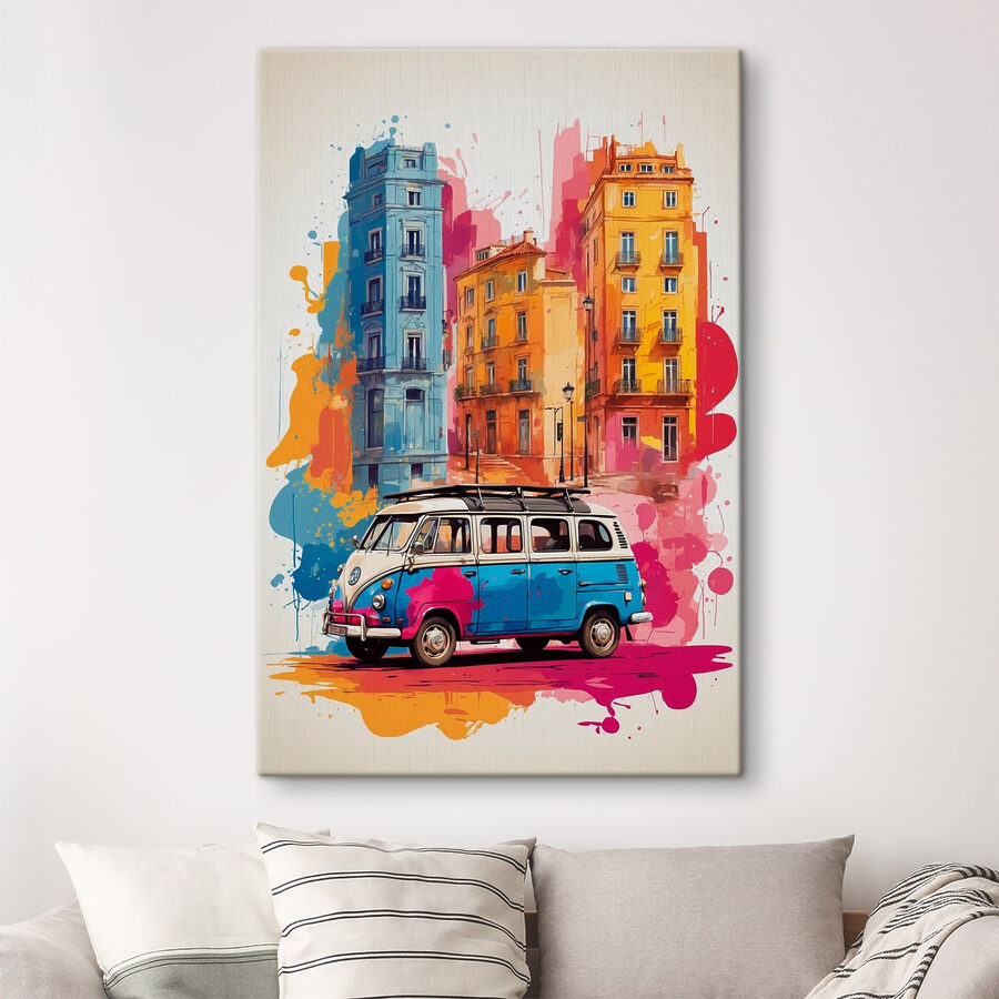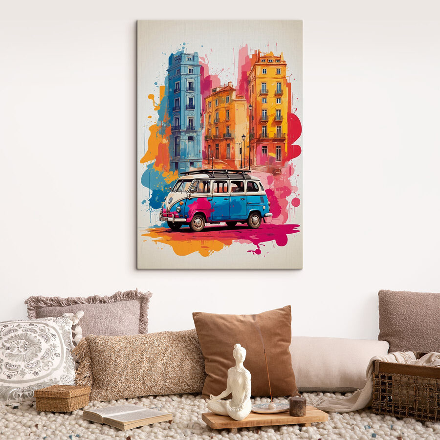 Wyobraź sobie: siedzisz w swoim przytulnym salonie, popijając poranną kawę i bum! Na ścianie pojawia się żywe płótno – mnóstwo kolorów z ożywionej furgonetki i rozbryzgany pejzaż miejski. To tak, jakby budynki zdecydowały, że potrzebują imprezy i nie powstrzymywały się. Idealny dla każdego, kto kocha odrobinę charakteru w swoim wystroju. To dzieło, które krzyczy kreatywnością, niemal ośmielając cię do wybrania się na wycieczkę, a może po prostu pomyślenia o tym, jak zabawne może być życie. Sprawi, że nawet poniedziałkowe poranki będą jak przygoda.