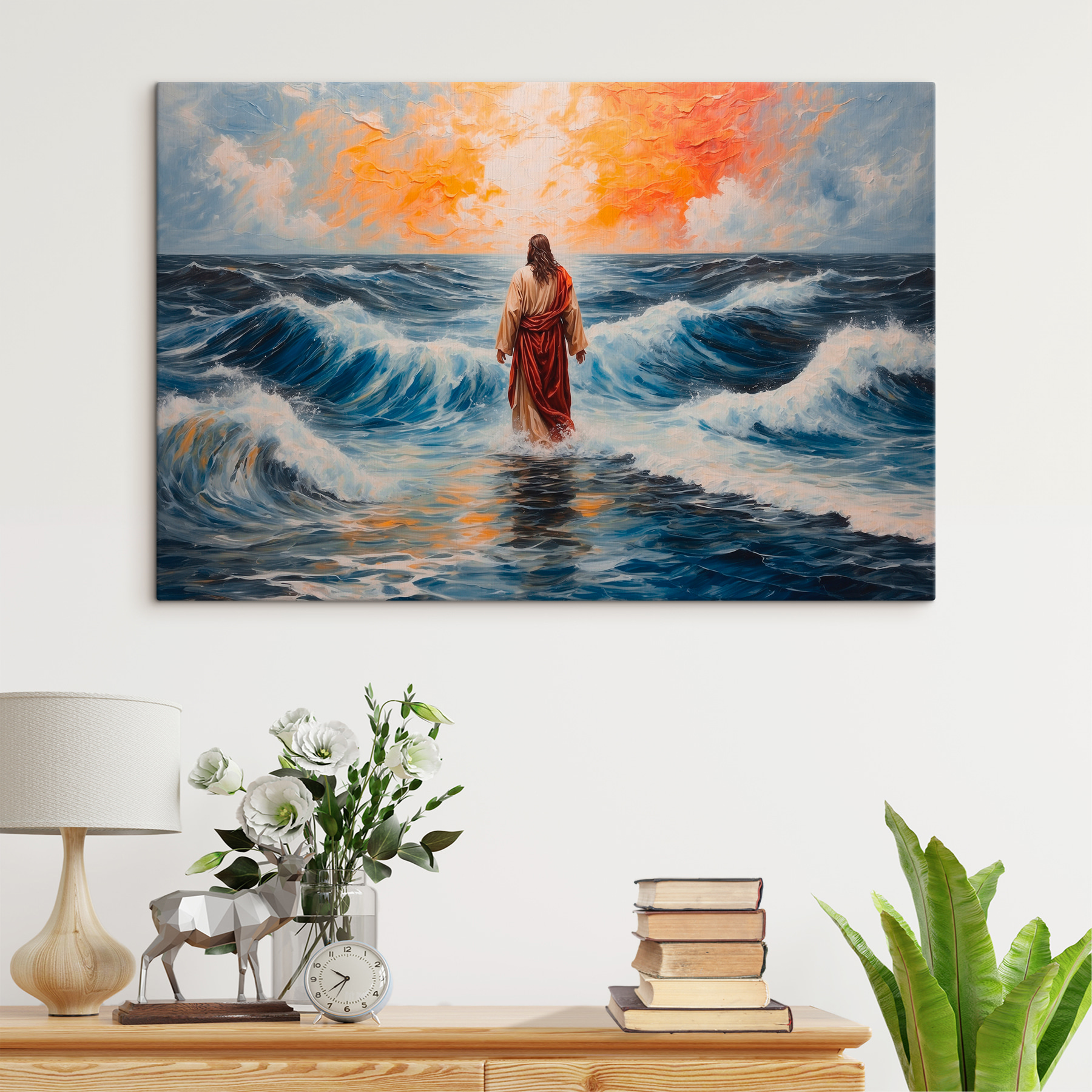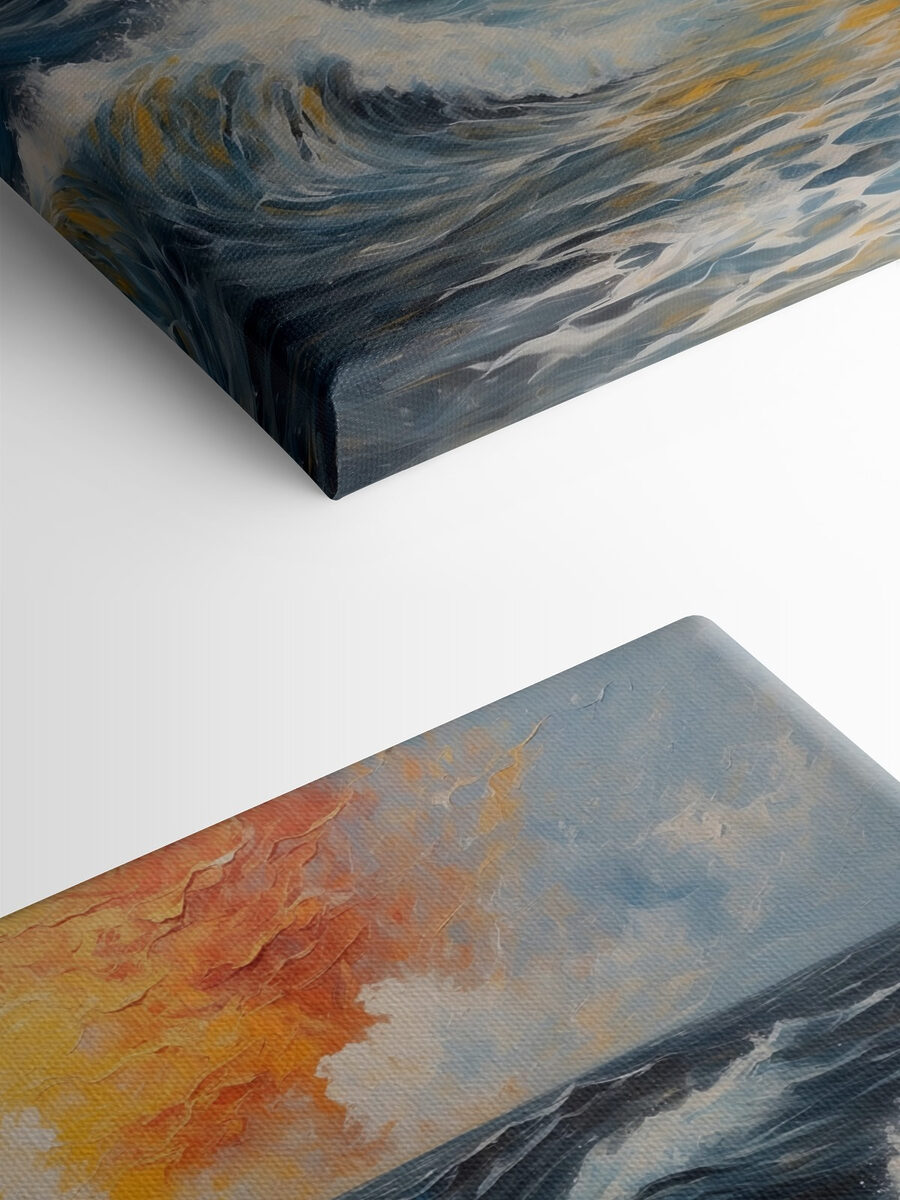 Wyobraź sobie, że wracasz do domu po długim dniu i widzisz to płótno na ścianie – to jak spokojna ucieczka prosto do salonu. Obraz przedstawiający mężczyznę stojącego w wodzie ma magiczny klimat. Może zastanawia się nad tajemnicami życia lub po prostu cieszy się mistycznym spacerem po falach. Bogaty błękit i ognisty zachód słońca łączą się w tę niesamowitą scenę. To coś więcej niż sztuka; to doświadczenie, które szepcze przygodę i kontemplację. Idealny do pobudzania rozmów podczas przyjęć – lub po prostu do marzeń w niedzielne popołudnie.