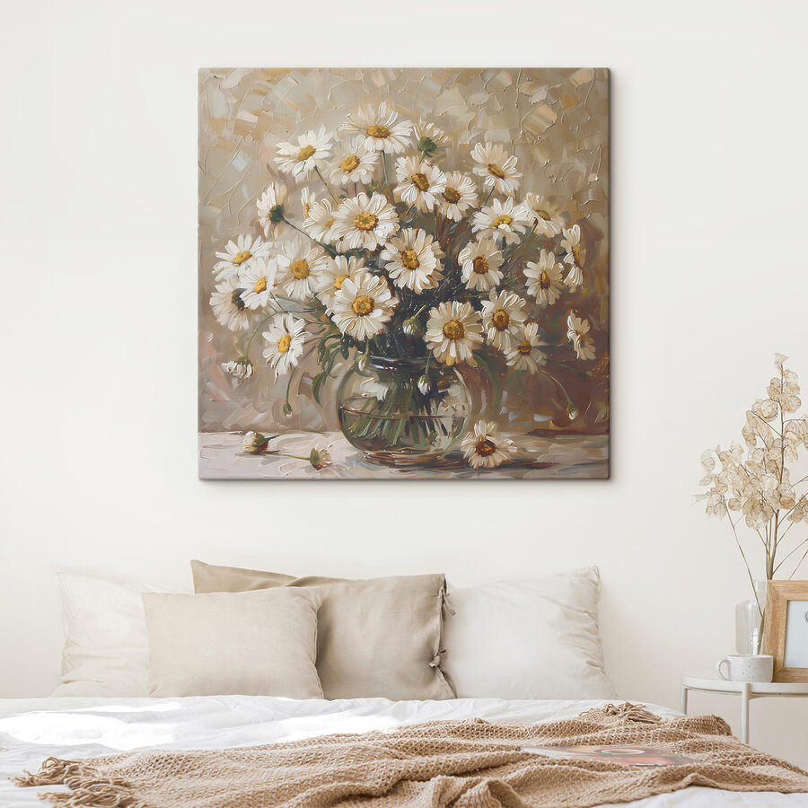 Rozjaśnij każde pomieszczenie tym uroczym wydrukiem na płótnie przedstawiającym zachwycający bukiet stokrotek w szklanym wazonie. Wyobraź sobie, że wchodzisz do pomieszczenia, w którym te wesołe kwiaty wywołują radość od razu, gdy na nie spojrzysz. To jak posiadanie małego kawałka natury w domu, szepczącego słodkie nuty ciepła i świeżości. Idealna do dodania odrobiny życia do przytulnego kącika do czytania lub słonecznej kuchni, ta grafika zachęca do uśmiechu i marzeń. Ponadto, jest coś szczególnego w stokrotkach – w jakiś sposób przypominają wszystkim o słonecznych dniach i beztroskich chwilach, prawda? Niezależnie od tego, czy jest to prezent, czy prezent dla siebie, z pewnością skradnie serca.