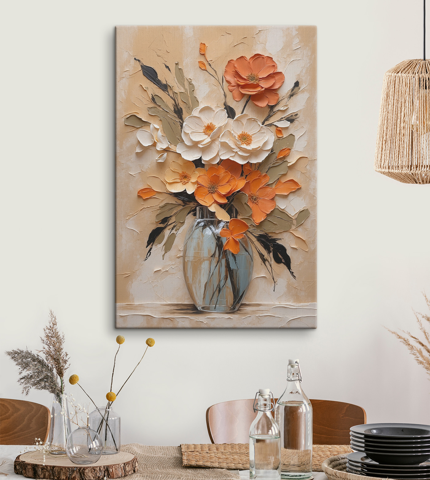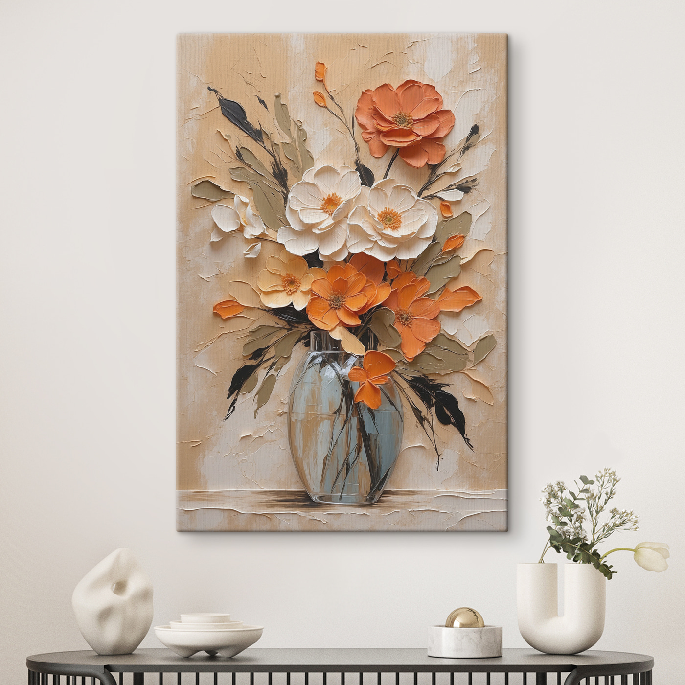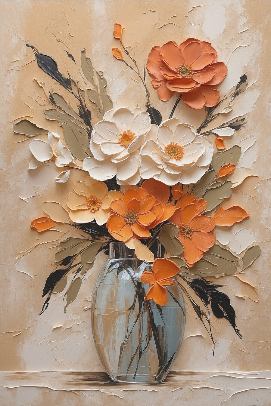 Wyobraź sobie, że wchodzisz do swojego salonu i wita Cię feeria barw, tak orzeźwiająca jak wiosenny poranek. Ten “Obraz Painting of Flowers in a Vase” to nie tylko dzieło sztuki – to osobowość, która czeka, aby rozjaśnić Twoją przestrzeń. Odważne pomarańcze i delikatne biele łączą się jak starzy przyjaciele, oferując zarówno ciepło, jak i elegancję. Wyobraź sobie: ponury poniedziałek, popijasz kawę, rzucasz okiem na to arcydzieło i voilà – natychmiastowa poprawa nastroju. To jak bukiet, który nigdy nie więdnie, zawsze dopingując twoje dobre wibracje. Idealny na każdą ścianę pragnącą odrobiny dodatkowej radości.