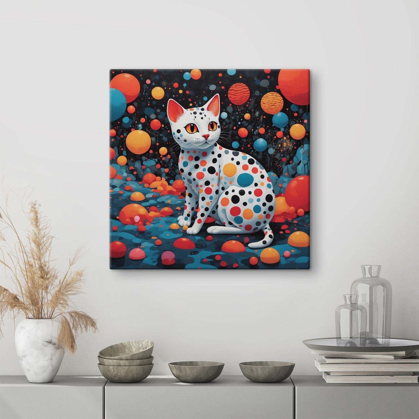 Przekształć każdą ścianę w dziwaczny początek rozmowy dzięki temu zachwycającemu drukowi na płótnie przedstawiającemu kota ozdobionego zabawnymi kropkami. To nie tylko sztuka; to zaproszenie do kapryśnego świata, w którym koty bawią się wśród kolorowych kul. Wyobraź sobie, że wchodzisz do pokoju i od razu czujesz przytulną atmosferę – ten obraz właśnie to robi! Wnosi on przypływ koloru i radości, idealny do rozjaśnienia nudnego kąta lub wywołania radości w pokoju dziecięcym. Wyobraź sobie deszczowy dzień, zwinięty w kłębek z książką i tego zabawnego kota patrzącego na ciebie. Jedyne, czego brakuje? Trochę kociego miauczenia. Idealny dla miłośników kotów i tych, którzy cenią sobie dobry chichot ponad tradycyjny wystrój!