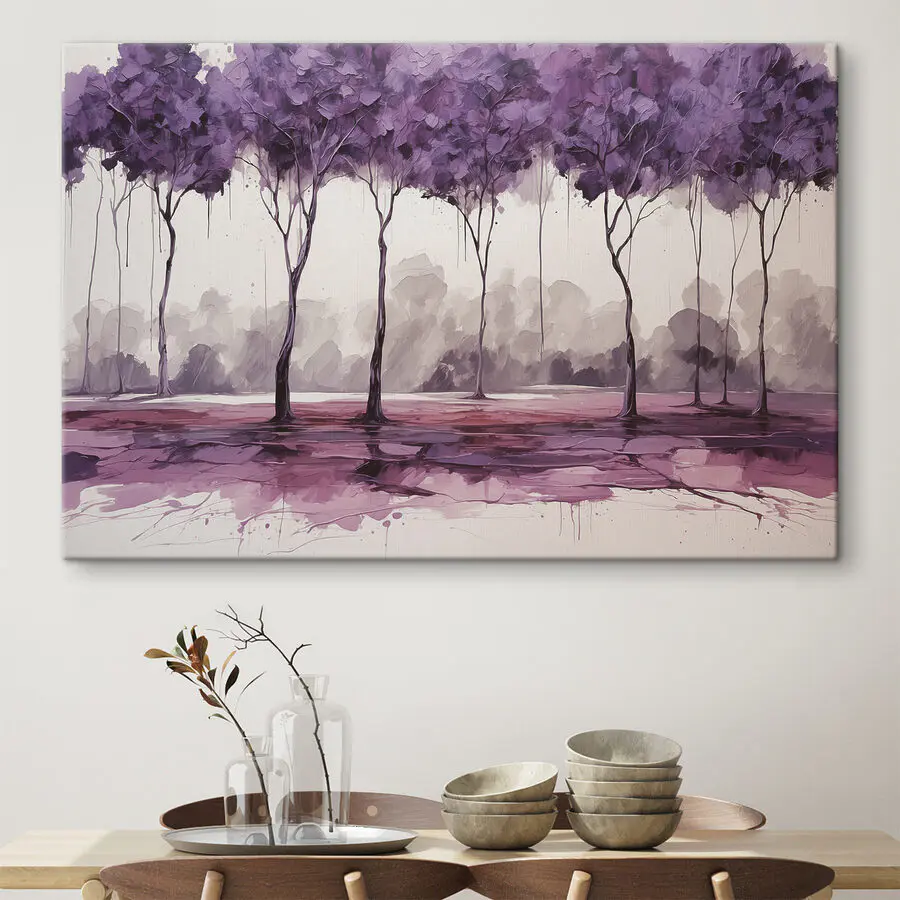 Przekształć dowolny pokój w senną ucieczkę dzięki temu płóciennemu wydrukowi drzew udrapowanych w czarujące fioletowe liście. Wyobraź sobie, że wylegujesz się w swojej przestrzeni, a każde spojrzenie na te żywe odcienie podnosi Cię na duchu, jak delikatna bryza w ciepły dzień. Abstrakcyjne pociągnięcia tworzą poczucie ruchu, jakby drzewa szeptały tajemnice z fantastycznego lasu. Jest idealny dla tych, którzy doceniają piękno natury, ale pragną odrobiny kaprysu. Zawieś go w miejscu, w którym będziesz mógł chłonąć jego urok i pozwól mu rozbudzać radość w codziennych chwilach. Kto by pomyślał, że dekoracja może być jak przyjazny uścisk?