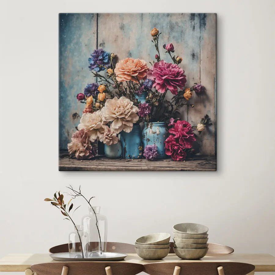 Wyobraź sobie odrobinę kwiatowej elegancji bezpośrednio na ścianie – ten wydruk na płótnie (Obraz s39161) doskonale oddaje ten rustykalny urok! Te zużyte słoiki z żywymi kwiatami wyglądają, jakby właśnie zostały zebrane ze starego wiejskiego ogrodu. Jest to słodkie miejsce, w którym vintage spotyka się z żywym, z miękkimi płatkami pięknie zderzającymi się z tymi zwietrzałymi, niebieskimi słoikami. Zawieś go, usiądź wygodnie i natychmiast poczuj ciepłą, przytulną atmosferę wypełniającą pomieszczenie. Jak powiew świeżego powietrza po delikatnym deszczu… To nostalgia i natura w jednym urzekającym elemencie. Twoi goście nie przestaną go podziwiać – obiecuję!