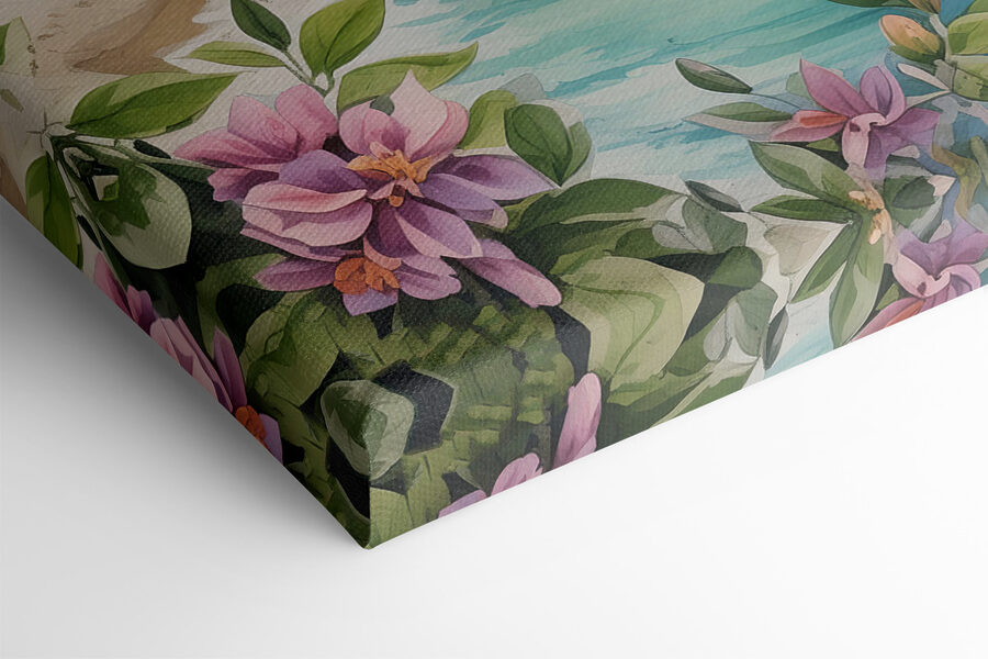 Wyobraź sobie, że wisi nad twoją kanapą… sprawia, że masz ochotę zwinąć się w kłębek z dobrą książką lub marzyć o następnych wakacjach, prawda? Jasne kwiaty na pierwszym planie dodają uroczego akcentu kolorystycznego, sprawiając, że całość jest żywa i świeża. A te łodzie zakotwiczone w zatoce? Można niemal usłyszeć delikatne szum fal…