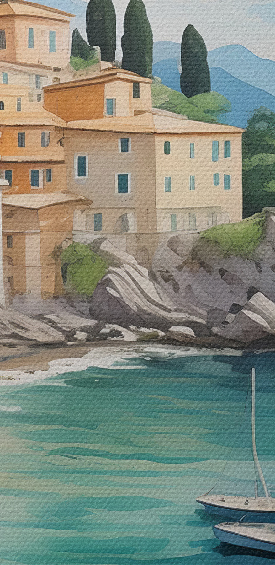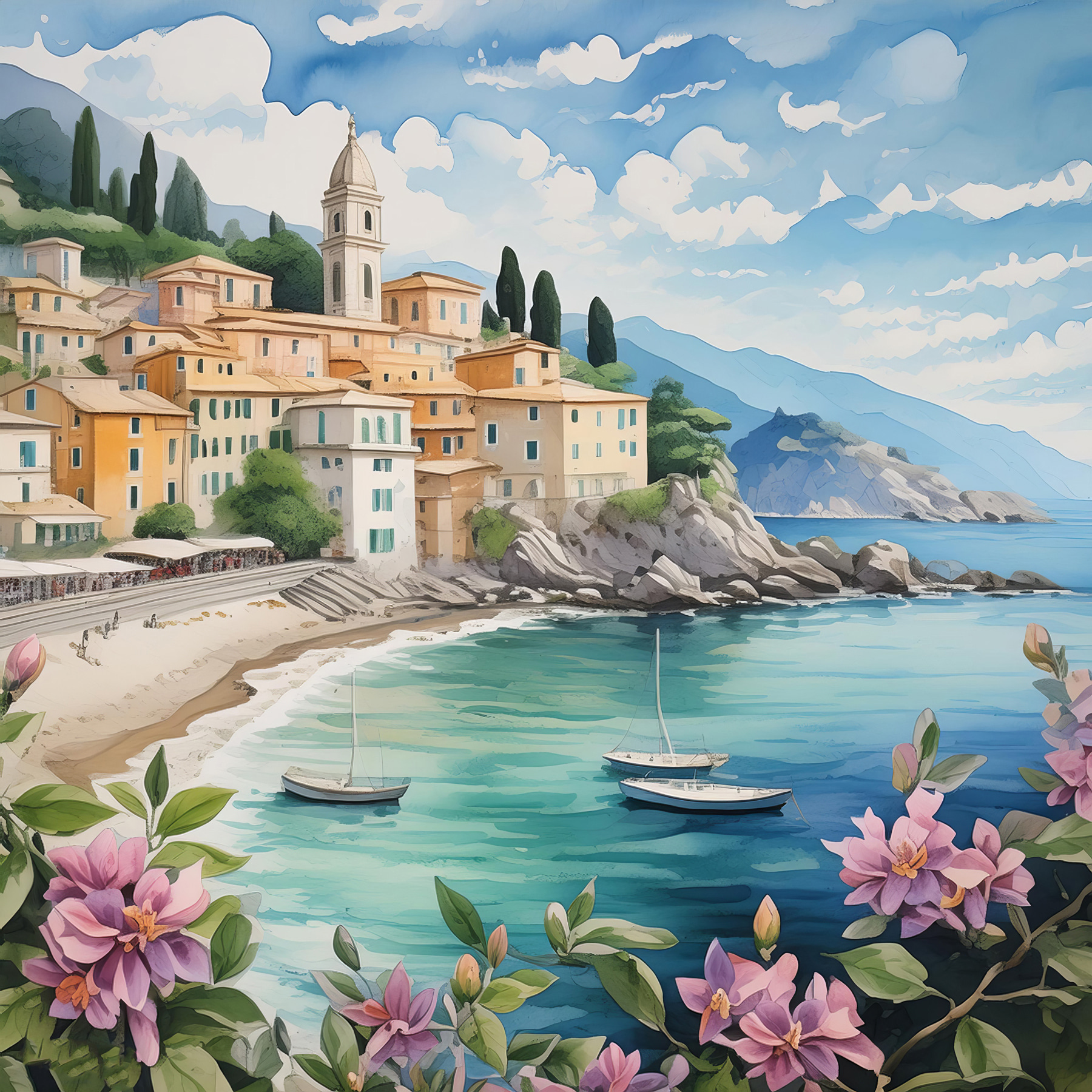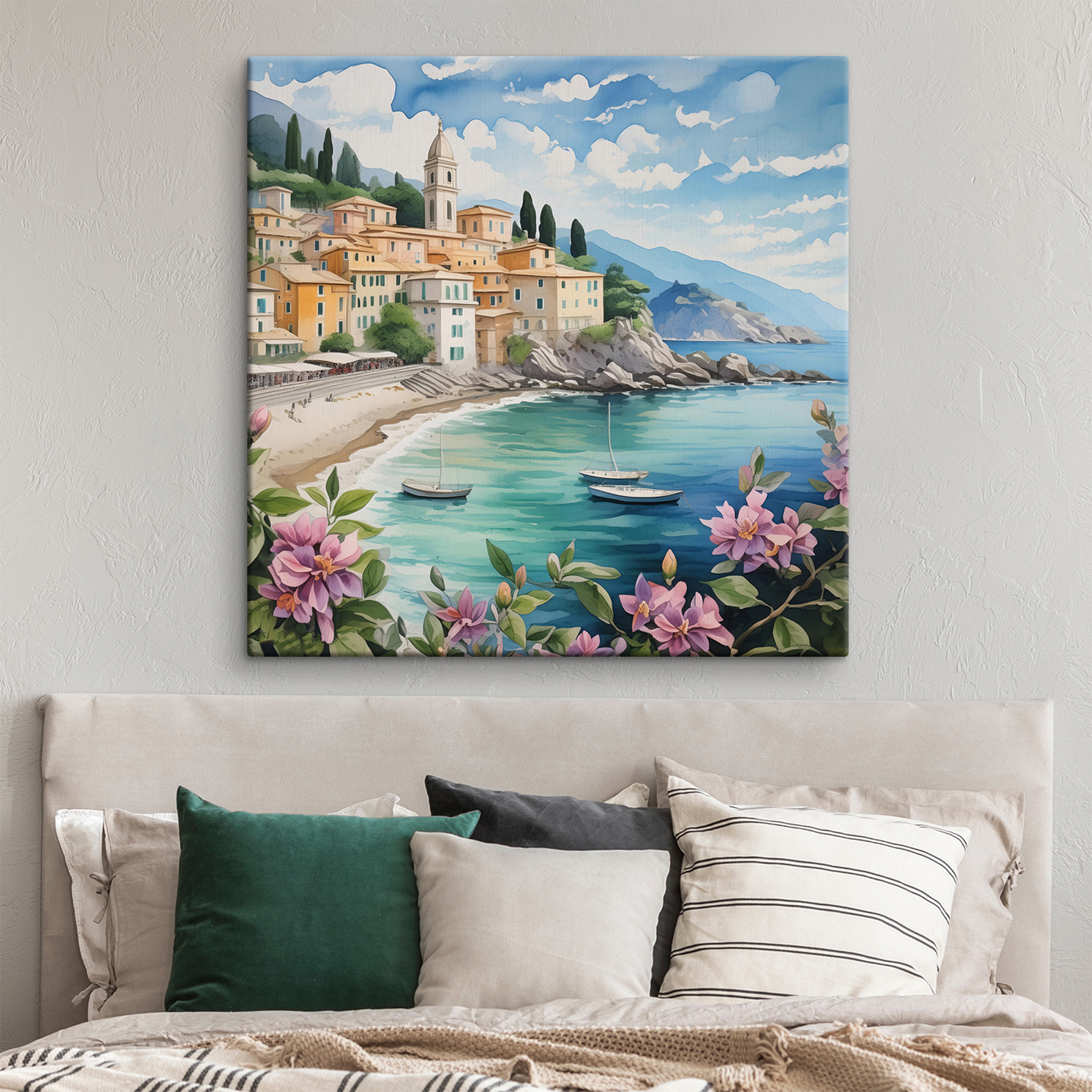 Wyobraź sobie, że wisi nad twoją kanapą… sprawia, że masz ochotę zwinąć się w kłębek z dobrą książką lub marzyć o następnych wakacjach, prawda? Jasne kwiaty na pierwszym planie dodają uroczego akcentu kolorystycznego, sprawiając, że całość jest żywa i świeża. A te łodzie zakotwiczone w zatoce? Można niemal usłyszeć delikatne szum fal…