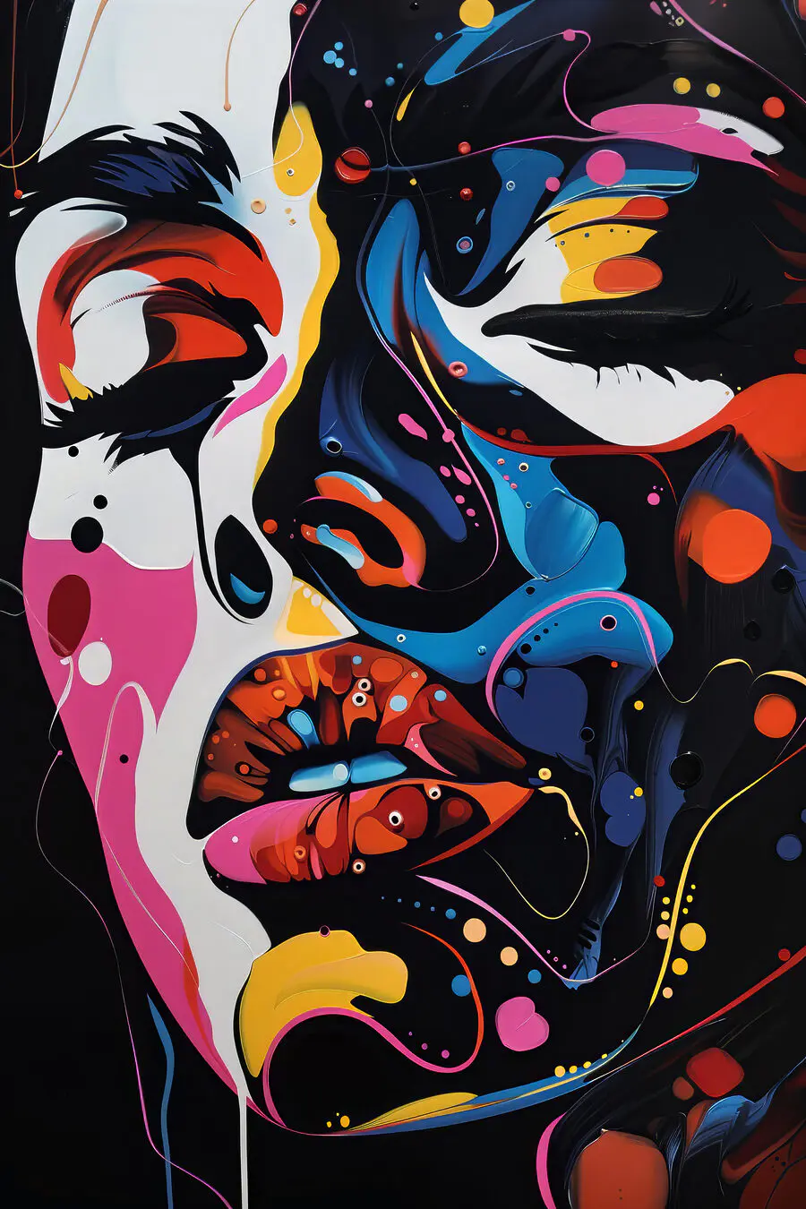 Zanurz się w tętniącym życiem świecie tego wydruku na płótnie, na którym twarz kobiety tryska kolorami i emocjami. Wyobraź sobie siebie w przytulnym kącie, popijającego kawę, podczas gdy jej zniewalające spojrzenie zdaje się mówić bezpośrednio do Ciebie. Zabawne wiry i odważne odcienie przynoszą poczucie radości i energii, które mogą odmienić każdą nudną przestrzeń.